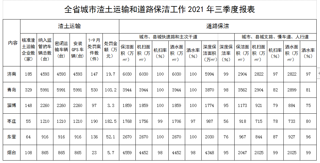 (三)城市道路保潔。各地不斷創(chuàng)新作業(yè)方式,提高工作標準,持續(xù)提升道路保潔水平。淄博市優(yōu)化道路保潔模式,實行“1洗、2掃、2灑”(夜間實施1次組團式深度保潔沖洗作業(yè),日間實施2次洗掃、2次灑水作業(yè)),組團式深度保潔采取“高壓清洗車+洗掃車”的作業(yè)方式,對機動車道進行全斷面深度保潔。棗莊市對照中央生態(tài)環(huán)保督察要求,抓好突出問題整改,嚴格落實渣土運輸企業(yè)報備制度,建立月調度和運輸企業(yè)評價制度。威海市制定道路深度保潔工作方案,對道路附屬設施實施深度保潔,推進深度保潔橫向鋪開、縱向深入。日照市實施沖洗保潔,在主次干道深度保潔基礎上,穩(wěn)步擴大范圍,進一步提升市民生活環(huán)境質量。濱州市加大資金投入,更新保潔機械設備,組建道路機械化清洗養(yǎng)護隊伍,推行人行道微水沖洗,實現(xiàn)城區(qū)硬化路面水洗全覆蓋。菏澤市開展“道路環(huán)境大清除”“衛(wèi)生死角大清理”“公共設施大清洗”等一系列專項行動,強化督導檢查,提高作業(yè)質量,深入推進道路揚塵治理。