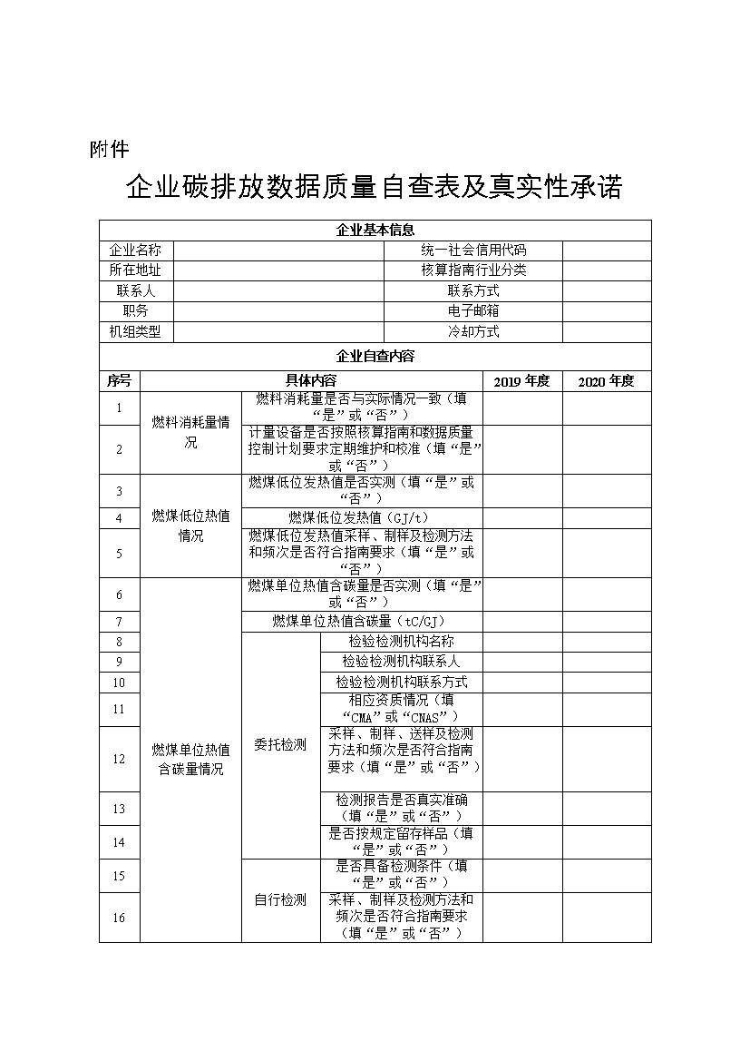 1.重點(diǎn)企業(yè)自查。嚴(yán)格執(zhí)行碳排放基礎(chǔ)數(shù)據(jù)“誰提供誰負(fù)責(zé)”的原則,納入全國碳市場燃煤發(fā)電企業(yè)(含自備電廠)按照核算指南對2019-2020年度碳排放數(shù)據(jù)及相關(guān)資料開展自查及核定工作,如實(shí)填寫基本情況、煤質(zhì)檢測機(jī)構(gòu)、委托服務(wù)機(jī)構(gòu)相關(guān)情況等(見附件),法人簽字并加蓋公章后于11月12日前報(bào)送自治區(qū)生態(tài)環(huán)境廳,電子版一并報(bào)送。