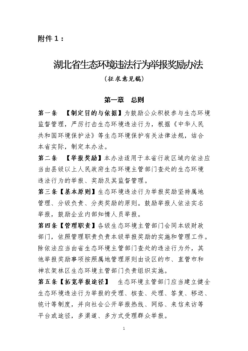 附件:1. 《湖北省生態(tài)環(huán)境違法行為舉報(bào)獎(jiǎng)勵(lì)辦法》(征求意見(jiàn)稿)