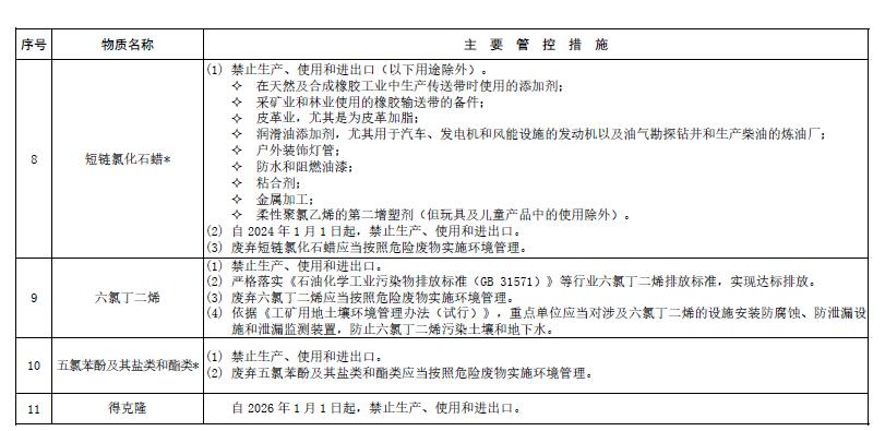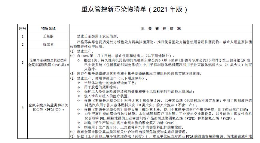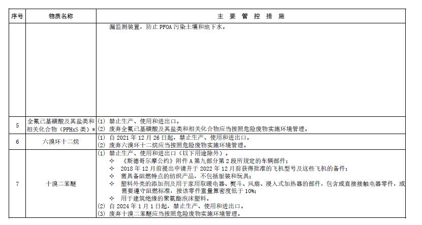 自2021 年12 月26 日起,禁止六溴環(huán)十二烷的生產(chǎn)、加工使用和進(jìn)出口;到2022 年底,禁止銷售含塑料微珠的日化產(chǎn)品。2025 年底前,逐步禁止PFHxS 類、十溴二苯醚、短鏈氯化石蠟、五氯苯酚及其鹽類和酯類、六氯丁二烯、得克隆的生產(chǎn)、加工使用和進(jìn)出口;嚴(yán)格限制PFOS 類、PFOA 類的生產(chǎn)和加工使用;禁止壬基酚用于農(nóng)藥助劑;基本實現(xiàn)二噁英類全面達(dá)標(biāo)排放。《生態(tài)環(huán)境部新污染物治理行動方案》(征求意見稿)