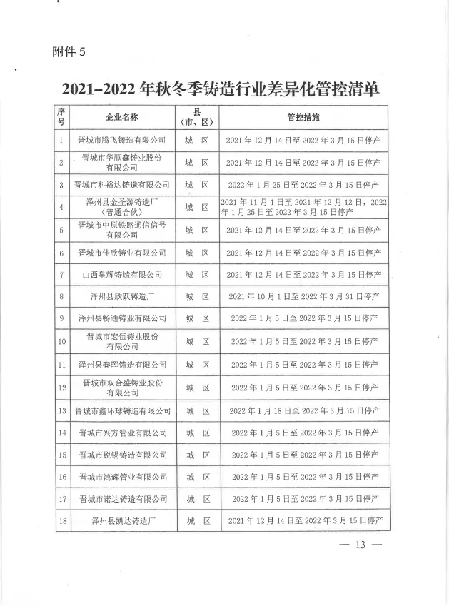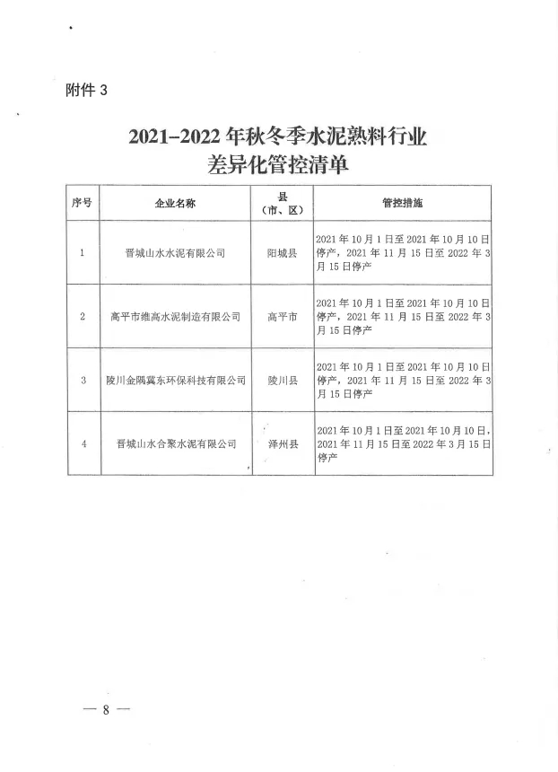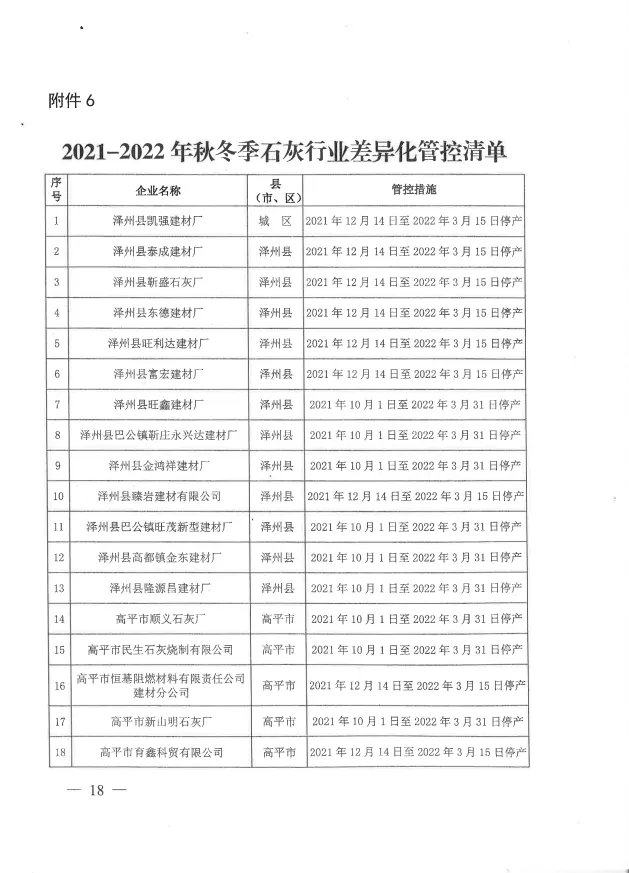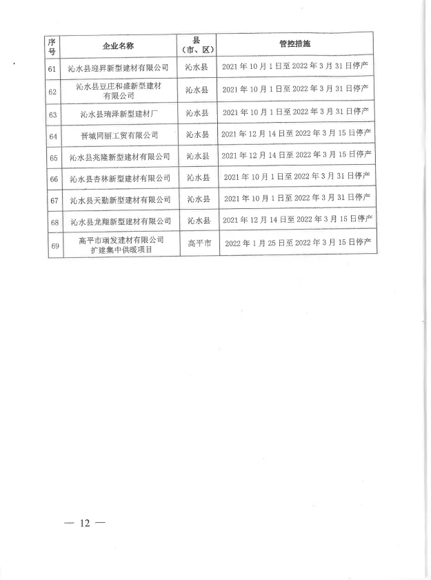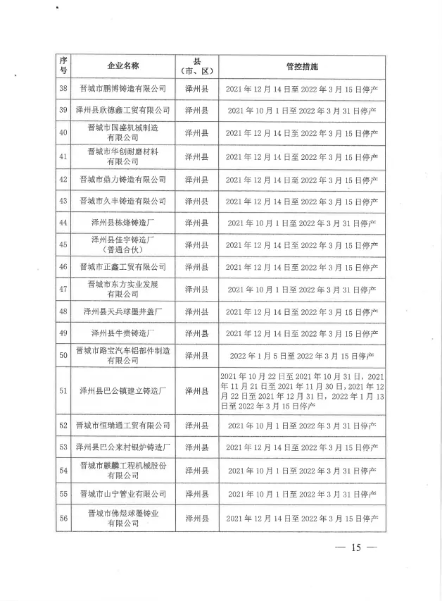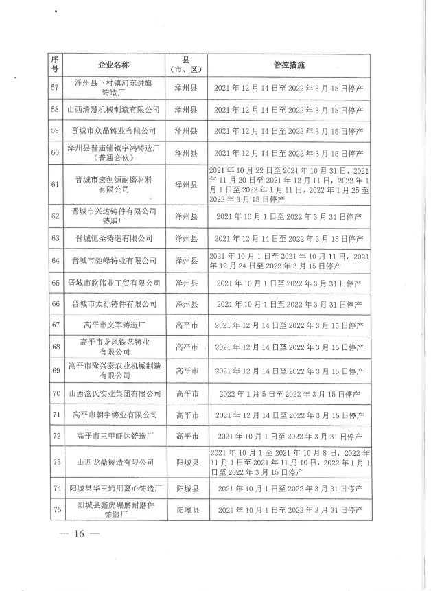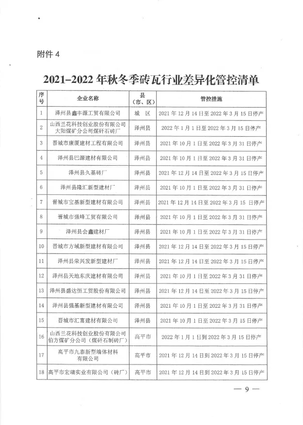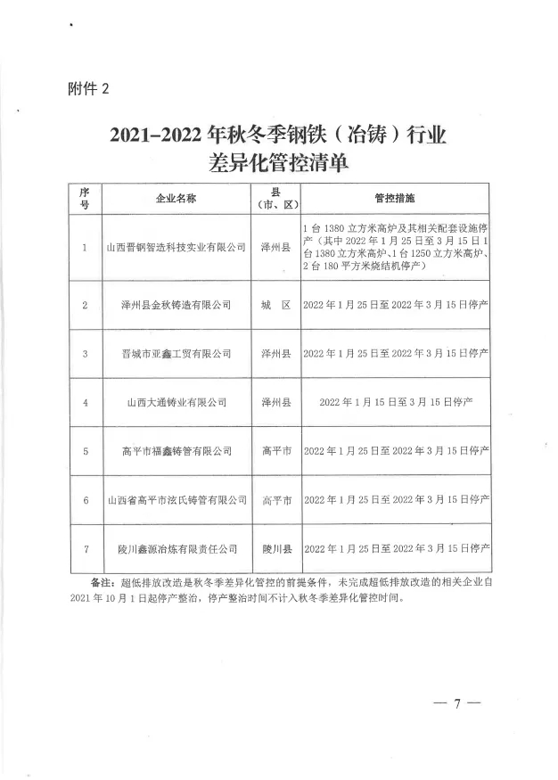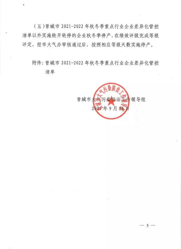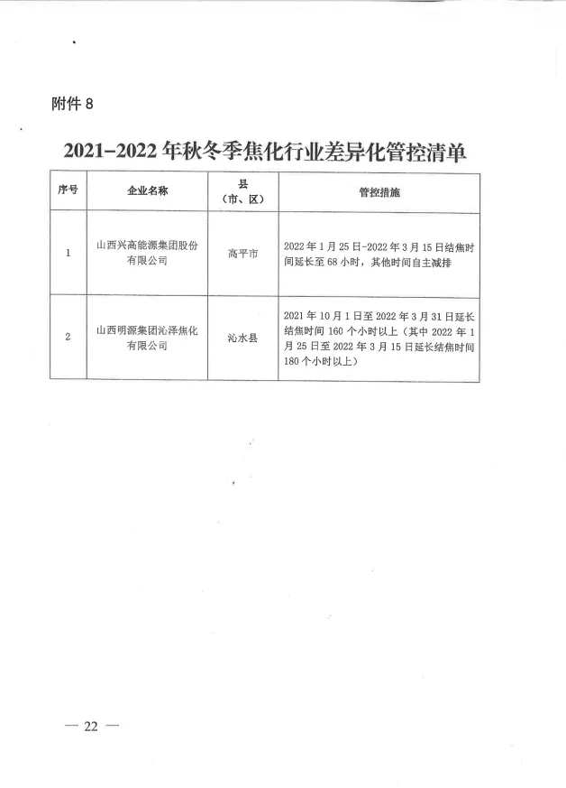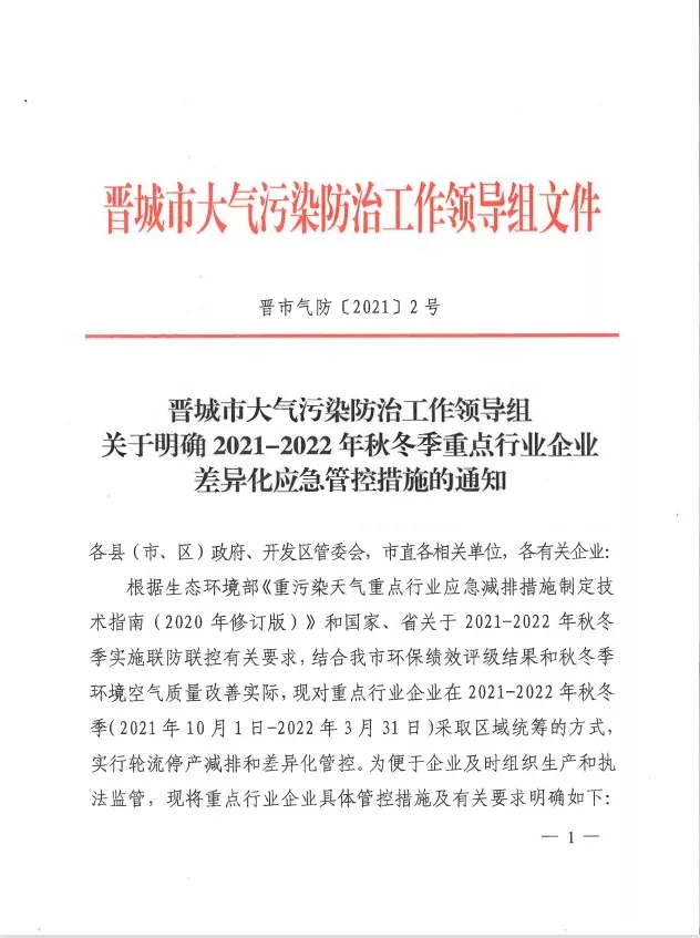 《晉城市關(guān)于明確2021-2022年秋冬季重點行業(yè)企業(yè)差異化應(yīng)急管控措施的通知》(晉市氣防【2021】2號)