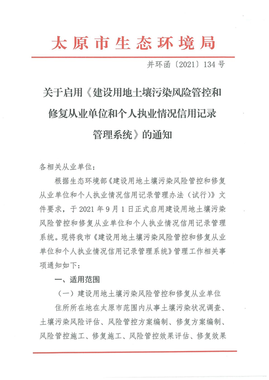 《太原啟用建設(shè)用地土壤污染風(fēng)險(xiǎn)管控和修復(fù)從業(yè)單位和個(gè)人執(zhí)業(yè)情況信用記錄管理系統(tǒng)》(并環(huán)函【2021】134號(hào))