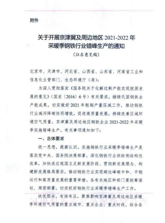 《關(guān)于開(kāi)展京津冀及周邊地區(qū)2021-2022年采暖季鋼鐵行業(yè)錯(cuò)峰生產(chǎn)的通知》(征求意見(jiàn)稿)
