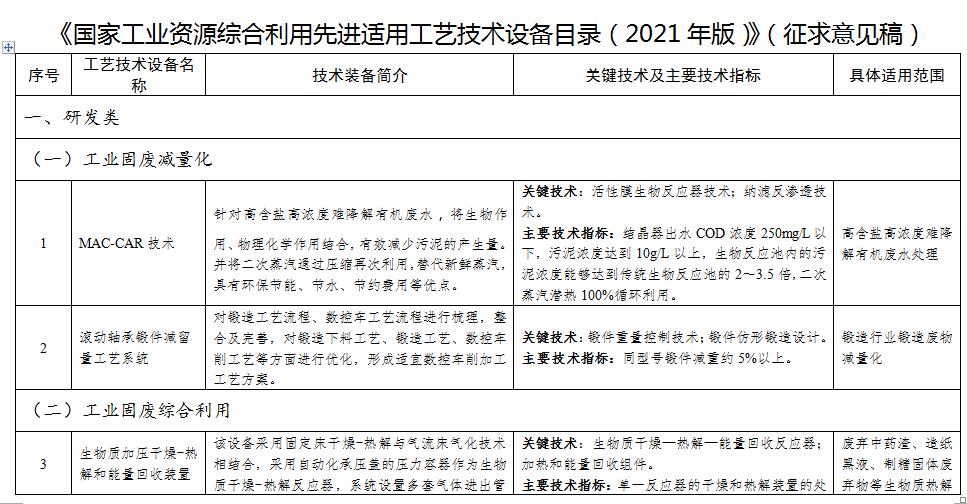 《國家工業(yè)資源綜合利用先進(jìn)適用工藝技術(shù)設(shè)備目錄(2021年版)》(征求意見稿)