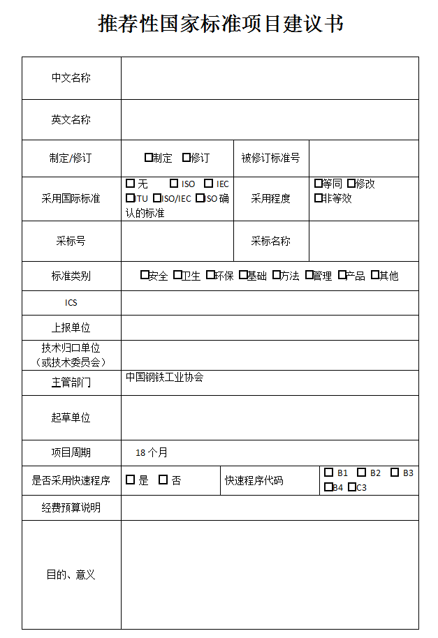 申報(bào)單位提報(bào)《推薦性國家標(biāo)準(zhǔn)項(xiàng)目建議書》(見附件)和國家標(biāo)準(zhǔn)草案(草案應(yīng)明確提出主要章節(jié)及各章節(jié)所規(guī)定主要技術(shù)內(nèi)容,內(nèi)容要詳實(shí)),word版發(fā)聯(lián)系人郵箱,截止時(shí)間為8月31日。
