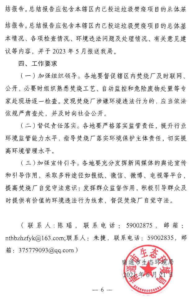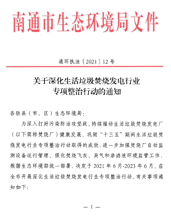 《江蘇南通關(guān)于深化生活垃圾焚燒發(fā)電行業(yè)專項(xiàng)整治行動(dòng)的通知》(通環(huán)執(zhí)法【2021】12號(hào))