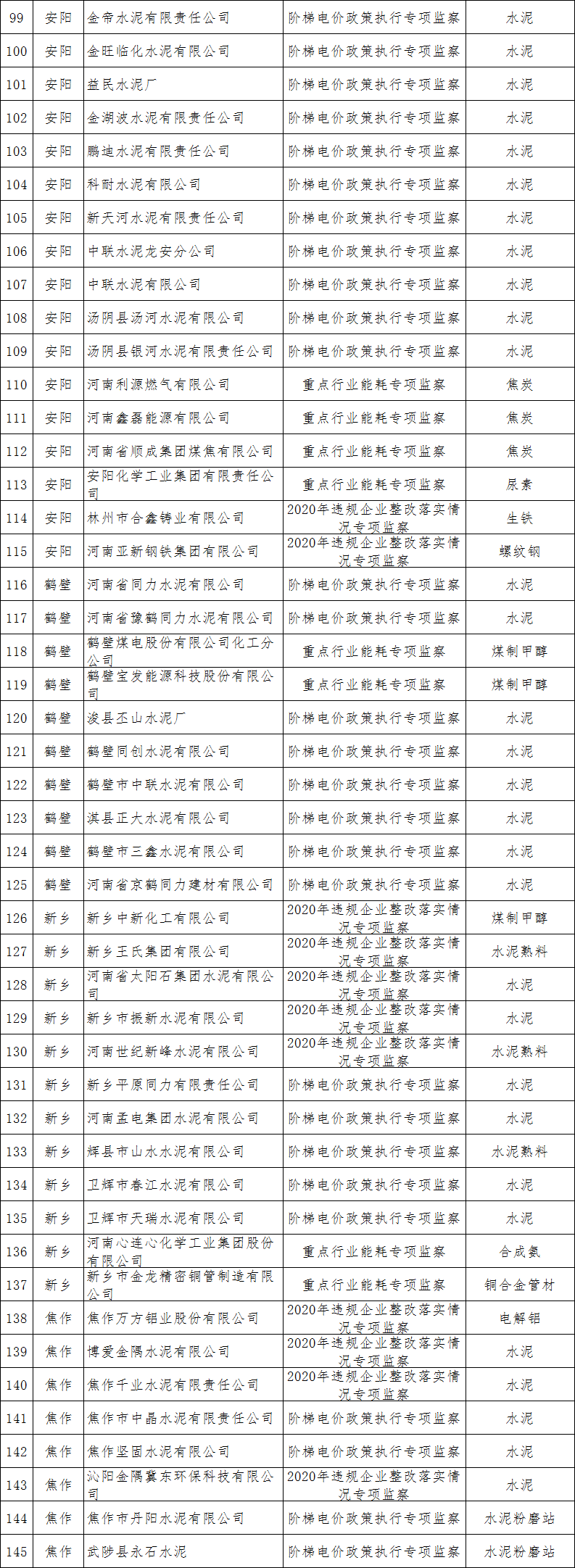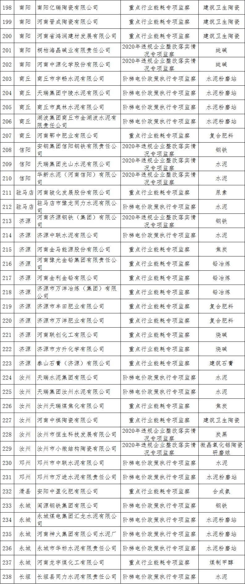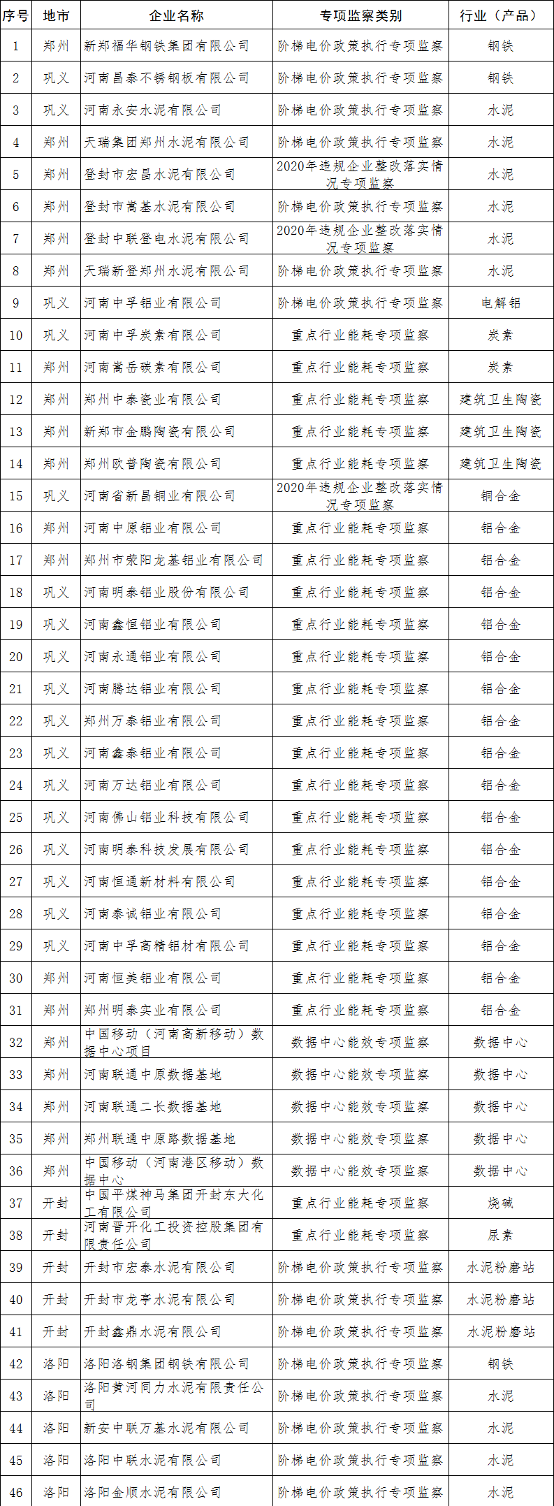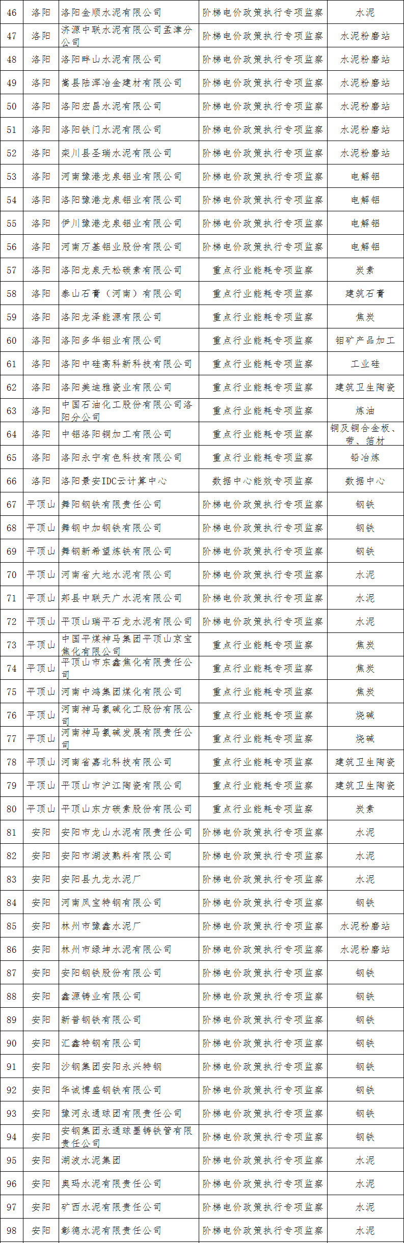 (二)116家階梯電價政策執(zhí)行專項監(jiān)察任務(wù)由各地市結(jié)合《河南省人民政府辦公廳關(guān)于完善差別化電價政策的通知》(豫政辦明電〔2018〕99號),依據(jù)《國家發(fā)展改革委 工業(yè)和信息化部關(guān)于運用價格手段促進鋼鐵行業(yè)供給側(cè)結(jié)構(gòu)性改革有關(guān)事項的通知》(發(fā)改價格〔2016〕2803號)、《國家發(fā)展改革委 工業(yè)和信息化部關(guān)于水泥企業(yè)用電實行階梯電價政策有關(guān)問題的通知》(發(fā)改價格〔2016〕75號)、《國家發(fā)展改革委 工業(yè)和信息化部關(guān)于電解鋁企業(yè)用電實行階梯電價政策額通知》(發(fā)改價格〔2013〕2530號)自主開展并將監(jiān)察能耗數(shù)據(jù)報送我廳及省節(jié)能和能源中心。各地市工業(yè)和信息化主管部門要認真督促接受監(jiān)察的數(shù)據(jù)中心企業(yè)按照能耗專項監(jiān)察工作手冊(附件2)完成相關(guān)自查工作并編寫自查報告,于8月15日前報送至省工業(yè)和信息化廳(節(jié)能與綜合利用處);
