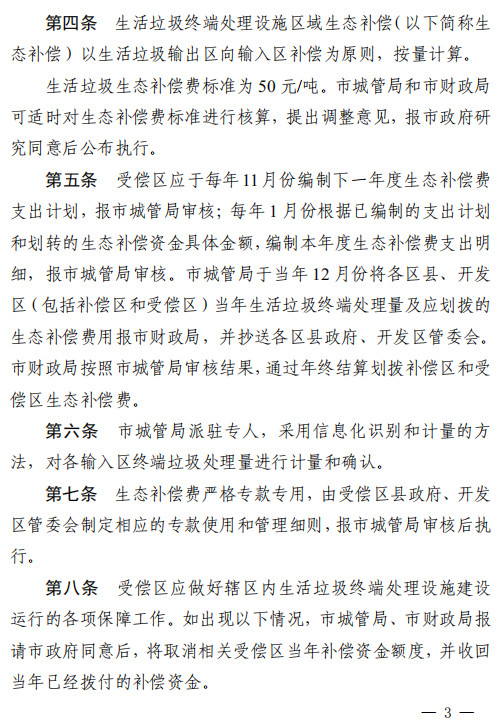 生活垃圾生態(tài)補償費標準為50元/噸。市城管局和市財政局可適時對生態(tài)補償費標準進行核算,提出調(diào)整意見,報市政府研究同意后公布執(zhí)行。