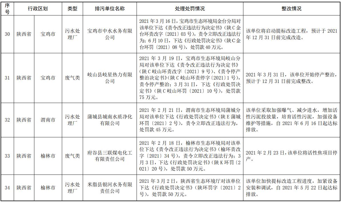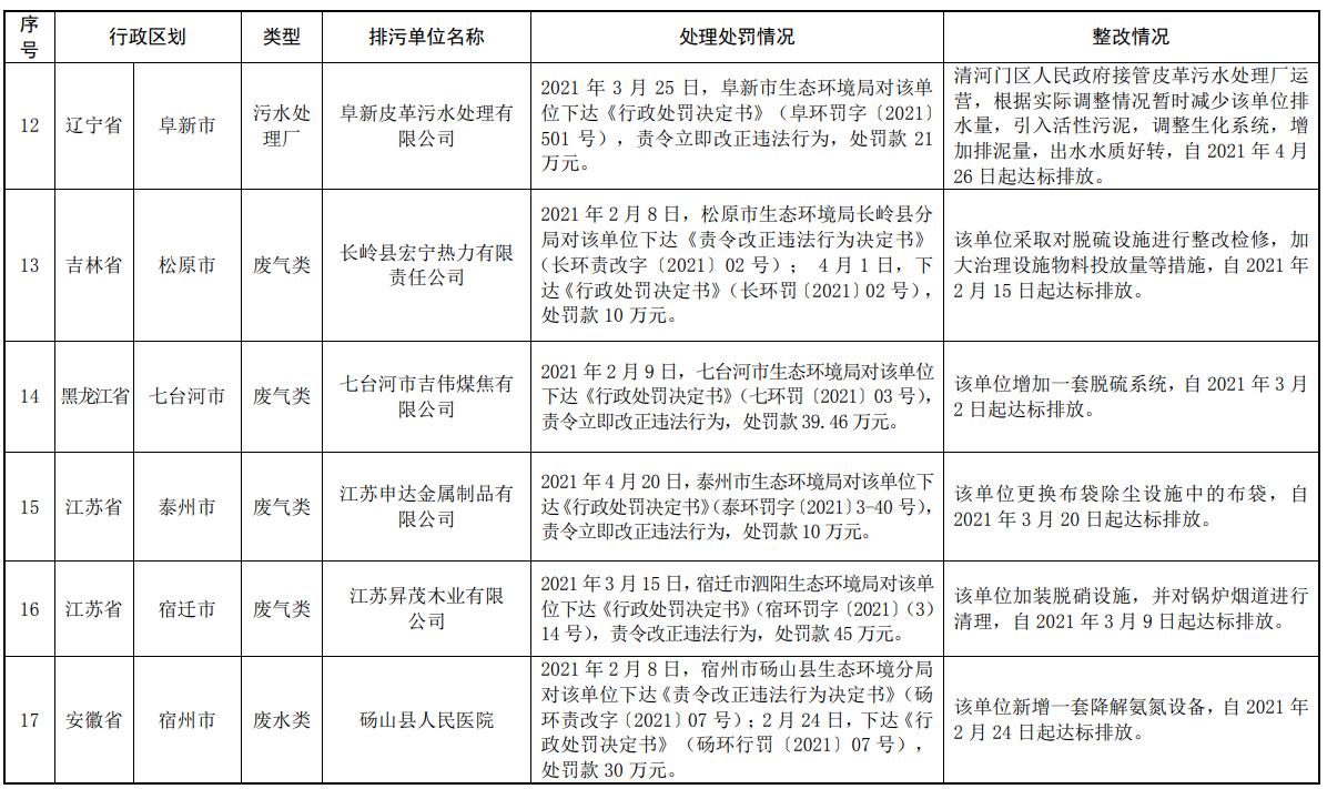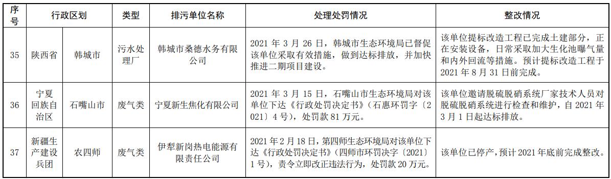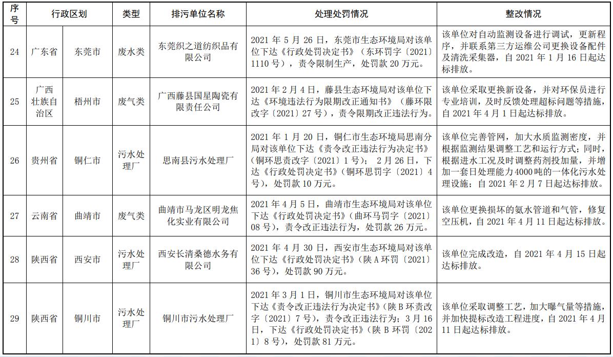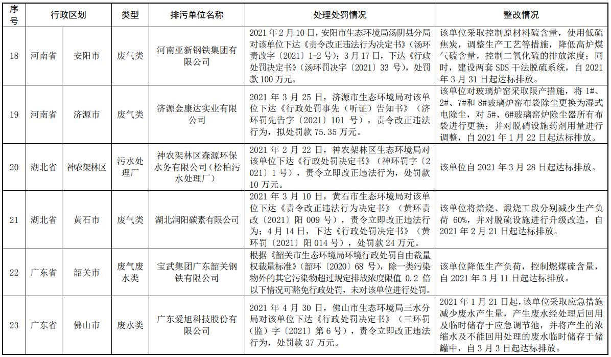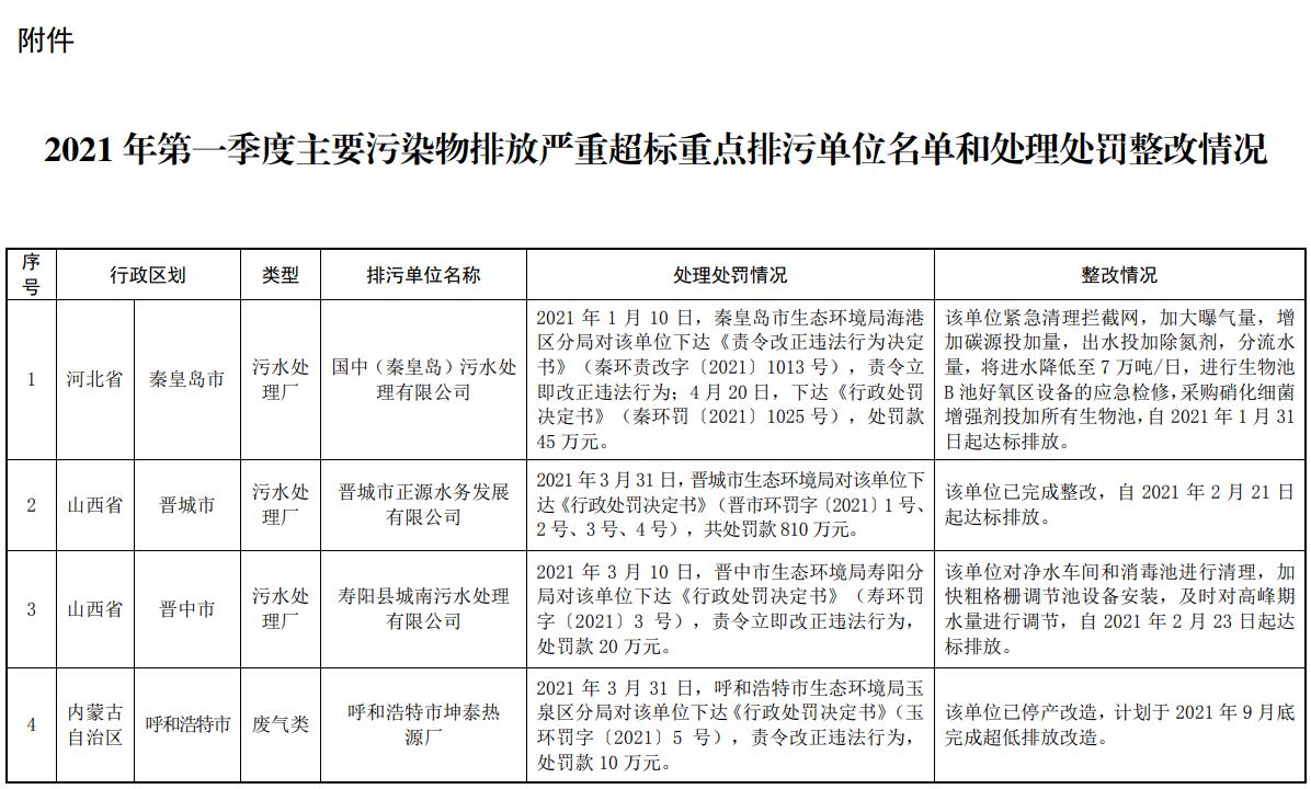《生態(tài)環(huán)境部通報2021年第一季度主要污染物排放嚴(yán)重超標(biāo)重點排污單位名單及其處理處罰、整改情況》