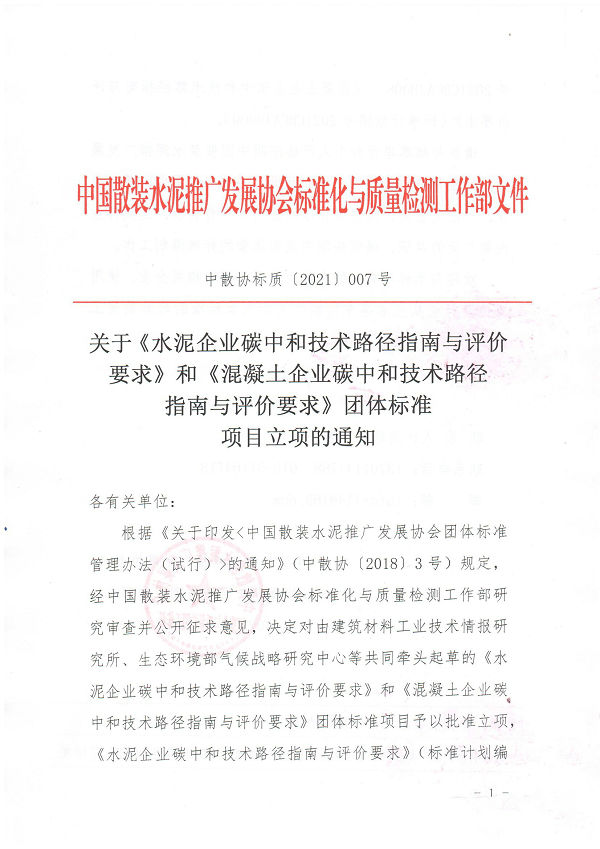 關(guān)于《水泥企業(yè)碳中和技術(shù)路徑指南與評價要求》和《混凝土企業(yè)碳中和技術(shù)路徑指南與評價要求》團體標(biāo)準(zhǔn)項目立項的通知