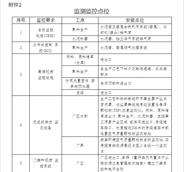 建設(shè)全廠污染物排放管、控、治一體化監(jiān)控平臺,全面加強自動監(jiān)控、過程監(jiān)控和視頻監(jiān)控設(shè)施建設(shè)。窯尾(含氨逃逸在線監(jiān)測)、窯頭、獨立烘干系統(tǒng)、水泥磨等均安裝自動監(jiān)控設(shè)施(CEMS)。水泥窯、窯尾煙氣處理系統(tǒng)均應(yīng)安裝分布式控制系統(tǒng)(DCS)。原料儲庫、成品裝卸平臺及輸送通道等重點工序安裝高清視頻監(jiān)控設(shè)施。廠區(qū)內(nèi)主要產(chǎn)塵點周邊、運輸?shù)缆穬蓚?cè)安裝空氣質(zhì)量顆粒物監(jiān)測設(shè)施,廠界安裝環(huán)境空氣質(zhì)量顆粒物自動監(jiān)測站。建設(shè)門禁系統(tǒng)和視頻監(jiān)控系統(tǒng),監(jiān)控運輸車輛進出廠區(qū)情況。DCS、CEMS監(jiān)控等數(shù)據(jù)至少保存一年以上,視頻監(jiān)控數(shù)據(jù)至少保存半年以上。上述監(jiān)測監(jiān)控設(shè)施隨治理設(shè)施同步建設(shè)或完善。具體要求見附件2。