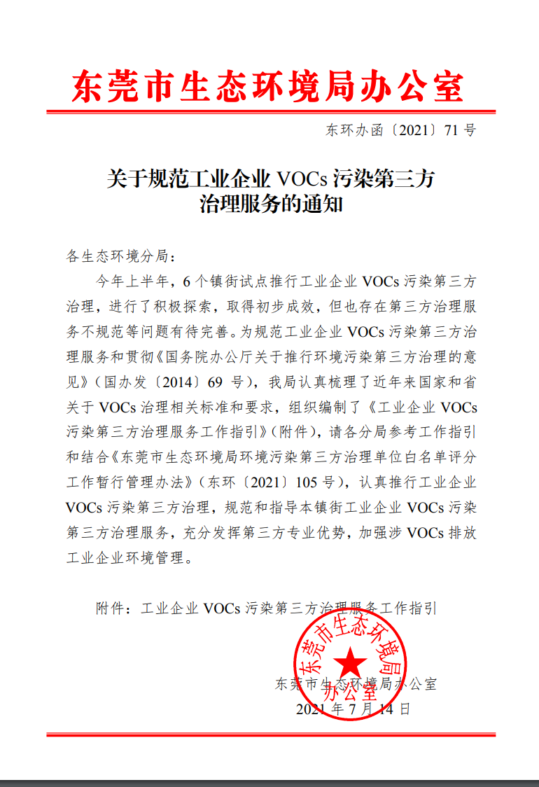 《東莞關(guān)于規(guī)范工業(yè)企業(yè)VOCs污染第三方治理服務(wù)的通知》(東環(huán)辦函【2021】71號(hào))