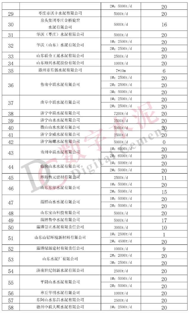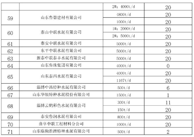 期間未按計(jì)劃執(zhí)行錯(cuò)峰生產(chǎn)的企業(yè)有:山東彼那尼榮安水泥有限公司、山東莒州水泥有限公司、濟(jì)寧海螺水泥有限公司、山東魯珠建材有限公司、棲霞白洋河水泥有限公司、冀東水泥(煙臺(tái))有限責(zé)任公司、龍口市泛林水泥有限公司、費(fèi)縣沂州水泥有限公司、泉頭集團(tuán)棗莊金橋旋窯水泥有限公司、滕州市東郭水泥有限公司、濰坊魯元建材有限公司、山東山鋁環(huán)境新材料有限公司、淄博魯中水泥有限公司、山東東華水泥有限公司、淄博崇正特種水泥有限責(zé)任公司、淄博綠源建材有限責(zé)任公司、淄博中昌特種水泥有限公司、山東華銀特種水泥股份有限公司、山東臨朐勝濰特種水泥有限公司。