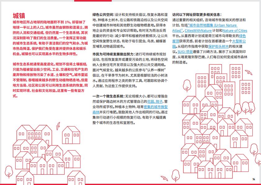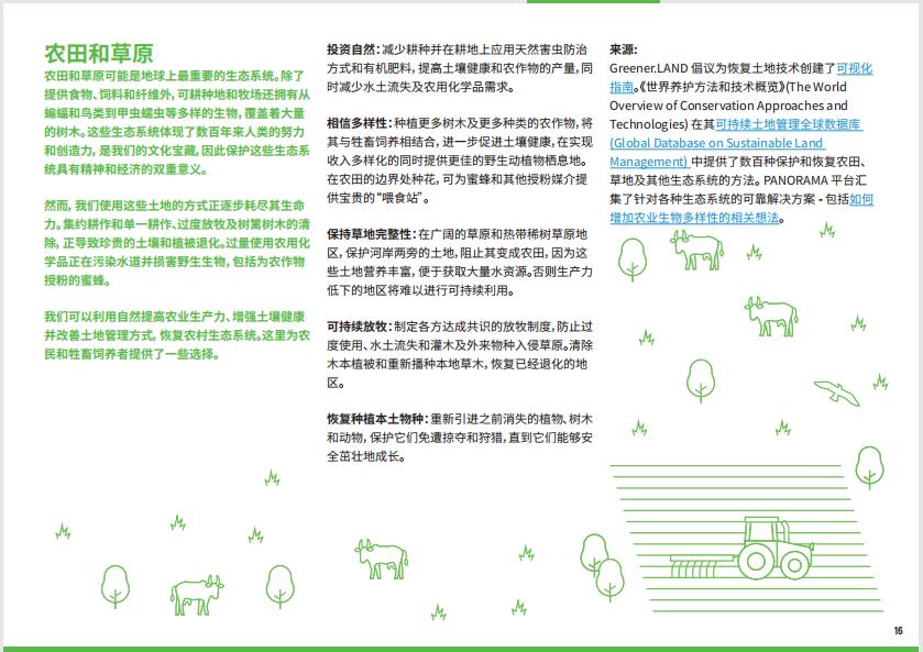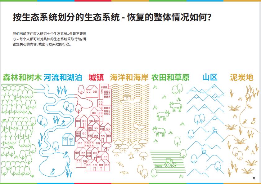 這份長(zhǎng)達(dá)21頁(yè)的指南介紹了恢復(fù)八種主要生態(tài)系統(tǒng)類型的方法——森林、農(nóng)田、草原和熱帶稀樹草原、河流和湖泊、海洋和海岸、城鎮(zhèn)和城市、泥炭地和山脈。它還列舉了社會(huì)各界——從個(gè)人和社區(qū)團(tuán)體到企業(yè)和政府——如何貢獻(xiàn)力量。詳情如下: