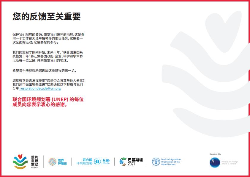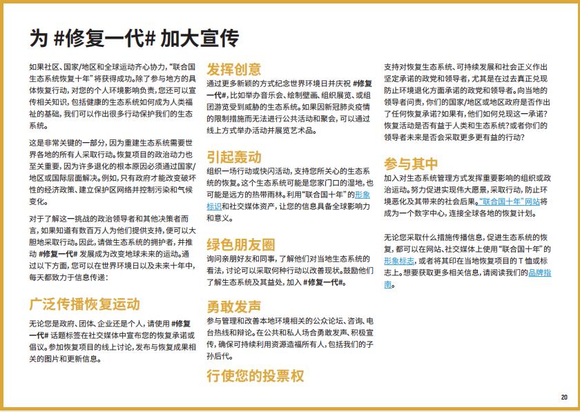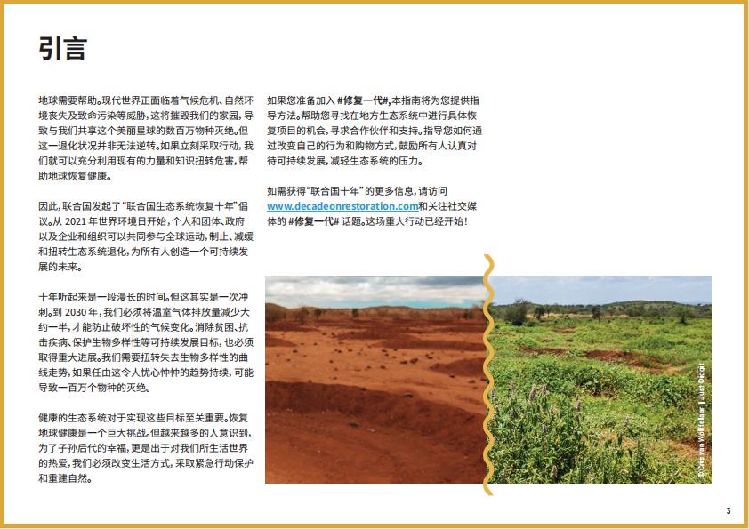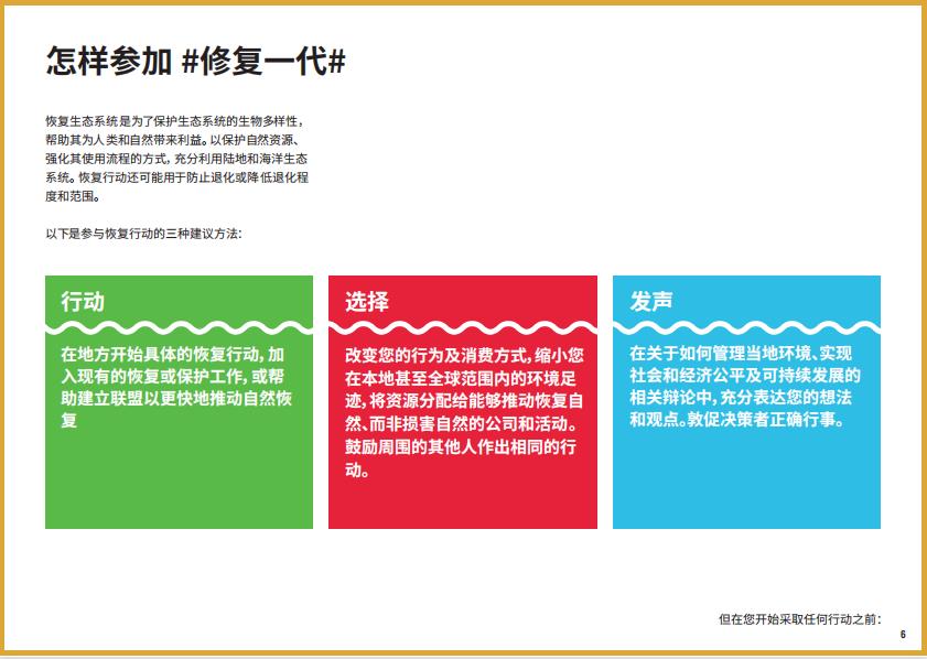《生態(tài)系統(tǒng)修復(fù)手冊(cè)》介紹了有助于減緩和阻止生態(tài)系統(tǒng)退化并促進(jìn)其恢復(fù)的一系列行動(dòng),概述了在即將步入的“聯(lián)合國(guó)十年”及未來(lái)更漫長(zhǎng)的歲月中參與生態(tài)系統(tǒng)修復(fù)的三大途徑: