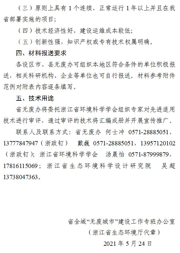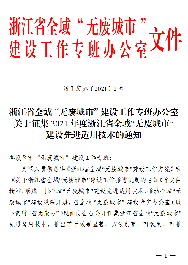 《浙江關(guān)于征集2021年度浙江省全域“無廢城市”建設(shè)先進(jìn)適用技術(shù)的通知》(浙無廢辦【2021】2號(hào))