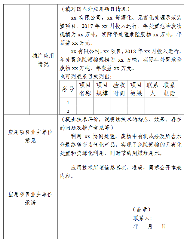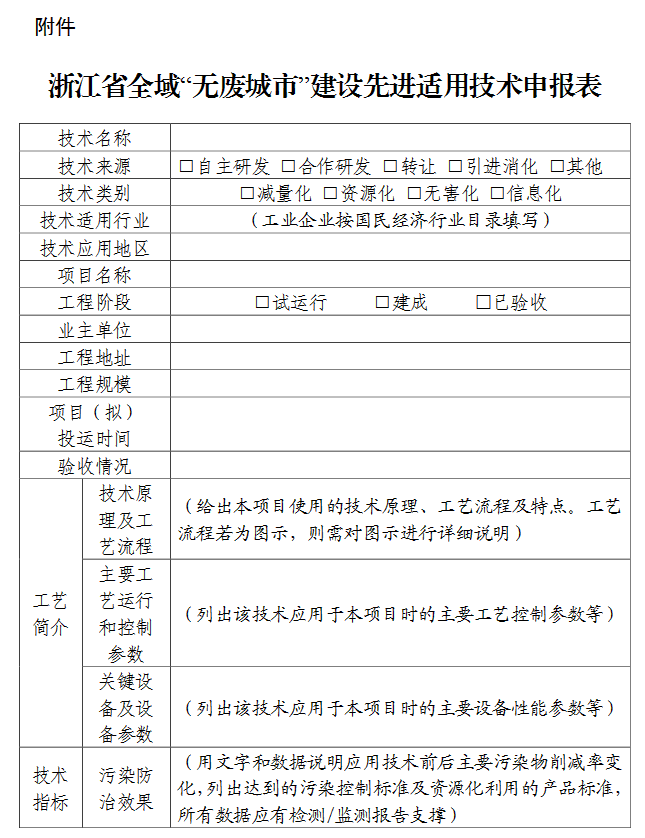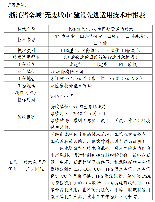 各設(shè)區(qū)市、縣無廢辦可組織本地區(qū)符合條件的單位積極報(bào)送,相關(guān)科研機(jī)構(gòu)、企業(yè)等單位也可自行報(bào)送。材料參考附件范例對(duì)附表內(nèi)容逐條填寫。請(qǐng)將案例電子稿發(fā)送至zjses_kjpj@163.com,郵件命名規(guī)則為“無廢城市技術(shù)申報(bào)+單位名稱”。紙質(zhì)版以市、縣無廢辦(或生態(tài)環(huán)境部門)名義報(bào)送學(xué)會(huì)(組織推薦),或單位(企業(yè))自行報(bào)送(自愿申報(bào)),注明聯(lián)系人及聯(lián)系方式。