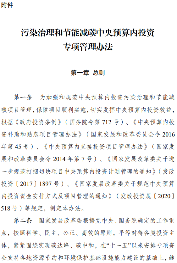 《污染治理和節(jié)能減碳中央預算內(nèi)投資專項管理辦法》(發(fā)改環(huán)資規(guī)〔2021〕655號)