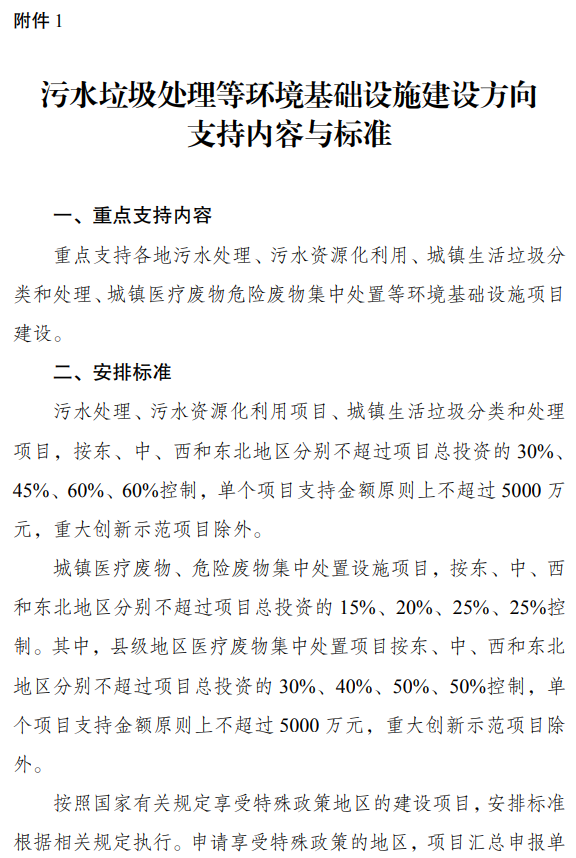 污水處理、污水資源化利用項目、城鎮(zhèn)生活垃圾分類和處理項目,按東、中、西和東北地區(qū)分別不超過項目總投資的 30%、 45%、60%、60%控制,單個項目支持金額原則上不超過 5000萬元,重大創(chuàng)新示范項目除外。