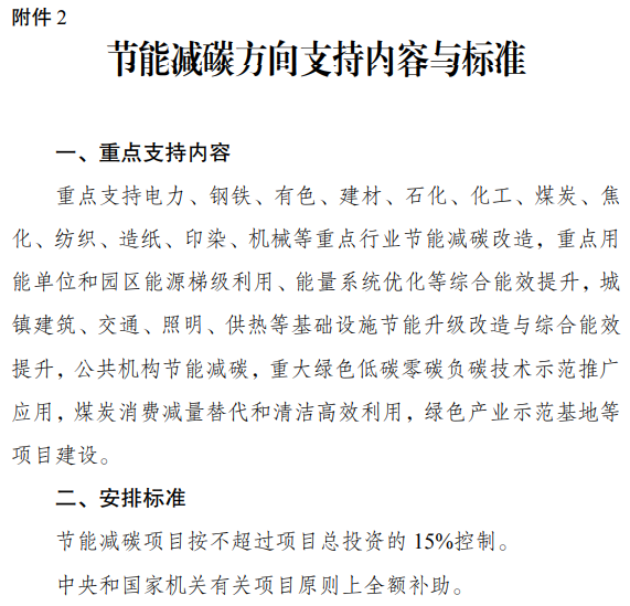 重點支持電力、鋼鐵、有色、建材、石化、化工、煤炭、焦 化、紡織、造紙、印染、機械等重點行業(yè)節(jié)能減碳改造,重點用能單位和園區(qū)能源梯級利用、能量系統(tǒng)優(yōu)化等綜合能效提升,城鎮(zhèn)建筑、交通、照明、供熱等基礎設施節(jié)能升級改造與綜合能效 提升,公共機構節(jié)能減碳,重大綠色低碳零碳負碳技術示范推廣應用,煤炭消費減量替代和清潔高效利用,綠色產(chǎn)業(yè)示范基地等項目建設。