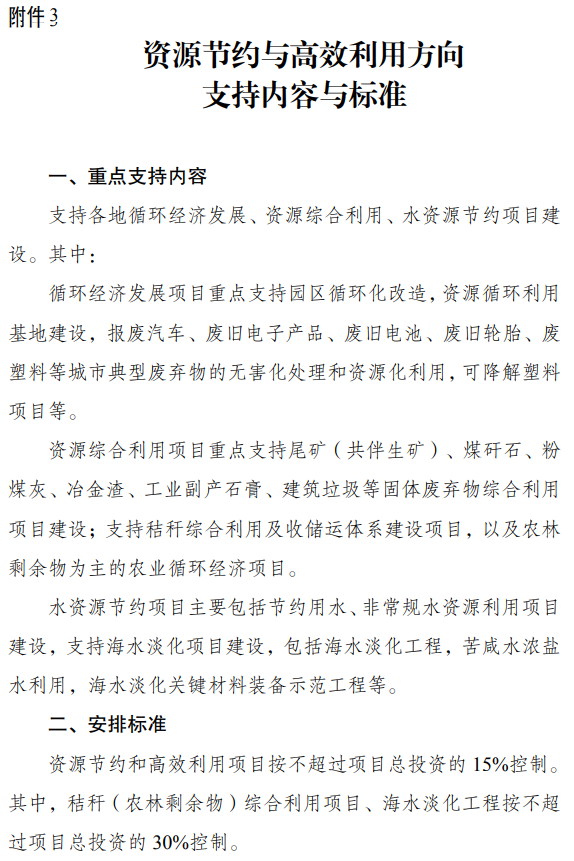 支持各地循環(huán)經(jīng)濟發(fā)展、資源綜合利用、水資源節(jié)約項目建設。資源節(jié)約和高效利用項目按不超過項目總投資的15%控制。 其中,秸稈(農(nóng)林剩余物)綜合利用項目、海水淡化工程按不超過項目總投資的 30%控制。