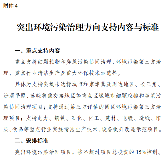 重點支持細顆粒物和臭氧污染協(xié)同治理、環(huán)境污染第三方治理、重點行業(yè)清潔生產(chǎn)及重大環(huán)保技術示范等。 具體為支持臭氧未達標城市和京津冀及周邊地區(qū)、長三角、 汾渭平原、蘇皖魯豫交接地區(qū)等重點區(qū)域城市細顆粒物和臭氧污染協(xié)同治理項目;支持通過第三方評估的園區(qū)環(huán)境污染第三方治理項目;支持電力、鋼鐵、石化、化工、建材、電鍍、造紙、印染、食品等重點行業(yè)實施清潔生產(chǎn)技術、設備提升改造示范項目。