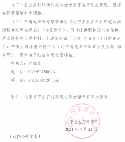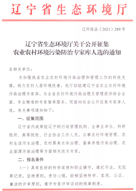 《遼寧省生態(tài)環(huán)境廳關(guān)于公開征集農(nóng)業(yè)農(nóng)村環(huán)境污染防治專家?guī)烊诉x的通知》(遼環(huán)綜函【2021】289號(hào))