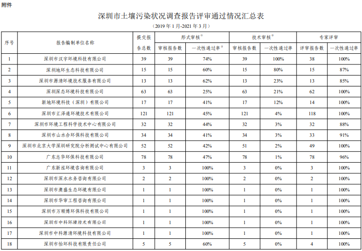《深圳市土壤污染狀況調(diào)查報告評審?fù)ㄟ^情況匯總表(2019年1月-2021年3月)》