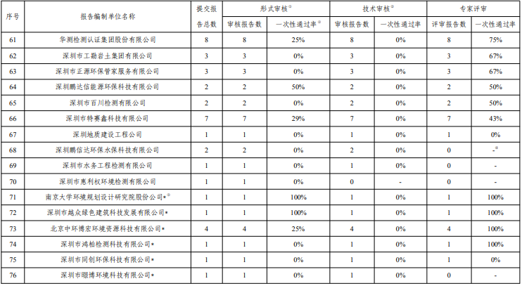 注:①我市對土壤污染狀況調(diào)查報告實行“形式審核-技術(shù)審核-專家評審”三級評審制度,上一級審核程序通過后方可進入下一級審核程序。 ②報告審核結(jié)果為基本符合技術(shù)規(guī)范的,視為通過技術(shù)審核。 ③同一報告僅統(tǒng)計各評審環(huán)節(jié)首次評審?fù)ㄟ^情況,經(jīng)退改后再次評審的通過情況不納入統(tǒng)計范圍。 ④統(tǒng)計時間范圍內(nèi),如某單位在某個評審環(huán)節(jié)沒有報告開展相關(guān)評審工作,該評審環(huán)節(jié)對應(yīng)表格內(nèi)填寫“-”。 ⑤帶“*”表示報告編制單位提交土壤污染狀況調(diào)查報告的數(shù)量連續(xù) 3 個季度未變化。報告編制單位如連續(xù) 4 個季度未提交新的土壤污染狀況調(diào)查報告,將視為近一 年內(nèi)未在我市開展土壤污染狀況調(diào)查業(yè)務(wù),不再納入統(tǒng)計范圍。 ⑥本季度新增 10 家報告編制單位,自 2019 年 1 月起,共有 23 家報告編制單位退出我市土壤污染狀況調(diào)查市場。