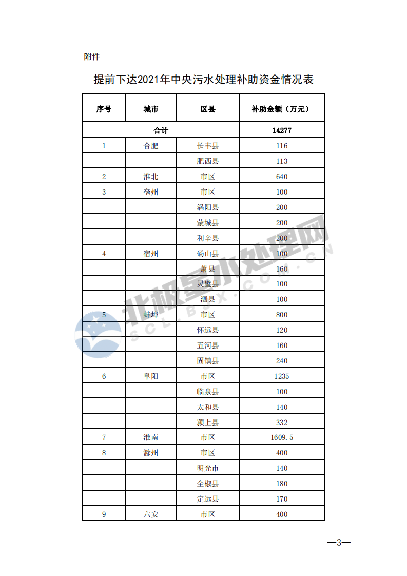 《安徽省下達2021年中央污水處理補助資金》(皖財建【2020】1547號)