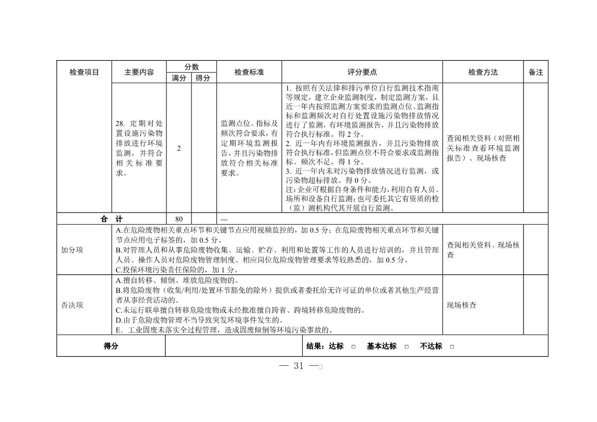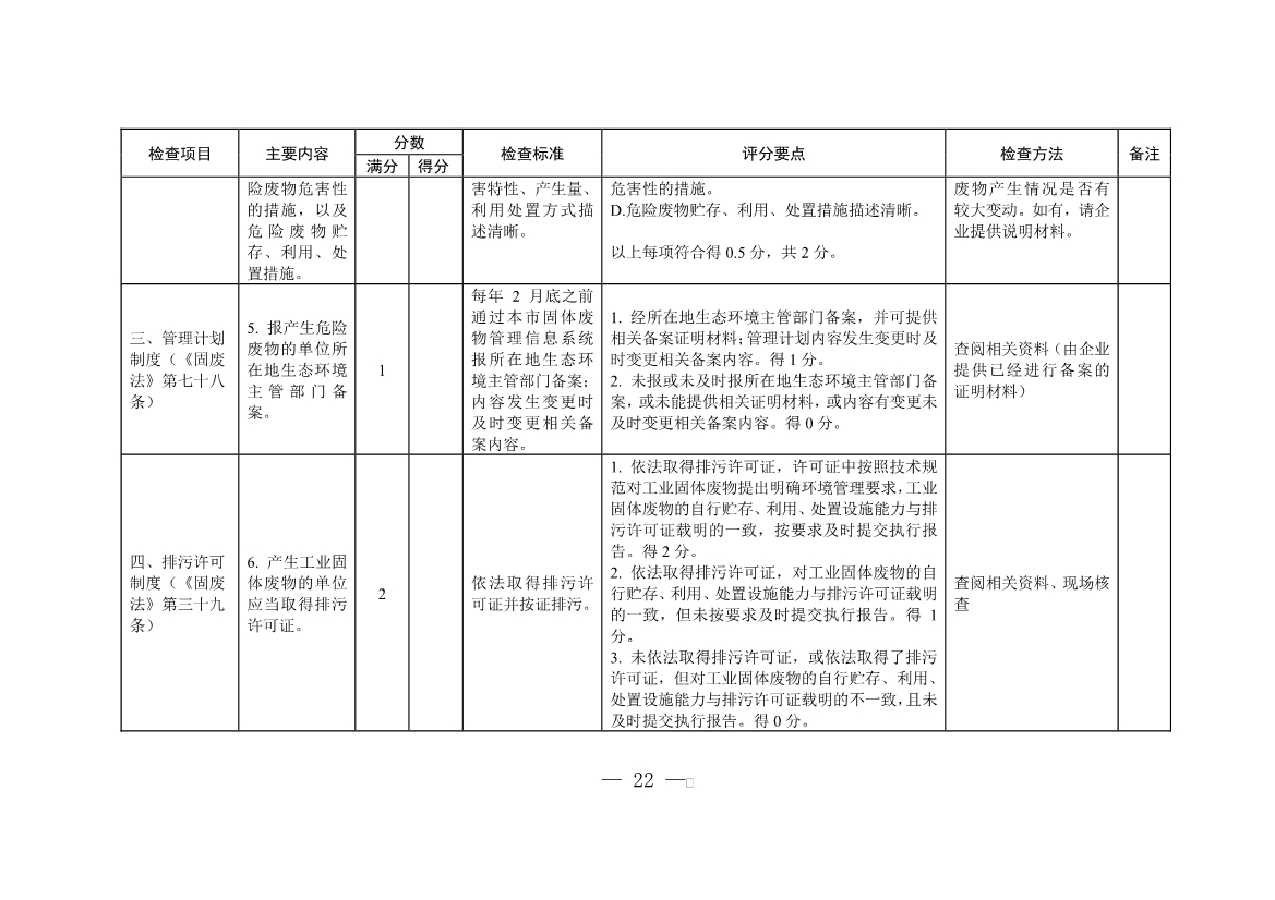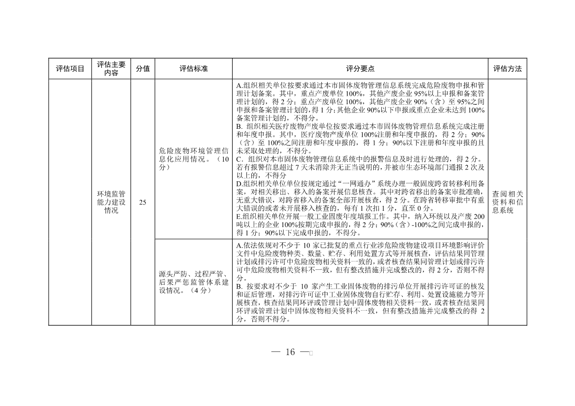 (二)市級(jí)評(píng)估。市生態(tài)環(huán)境局每年按照《危險(xiǎn)廢物規(guī)范化環(huán)境管理評(píng)估指標(biāo)》(附件1,以下簡稱《評(píng)估指標(biāo)》)評(píng)估各區(qū)危險(xiǎn)廢物規(guī)范化環(huán)境環(huán)境管理情況,并對(duì)本市危險(xiǎn)廢物規(guī)范化環(huán)境環(huán)境管理情況進(jìn)行自評(píng)。市環(huán)境執(zhí)法總隊(duì)按照《檢查要點(diǎn)》(附件2)附表2-1對(duì)市管危險(xiǎn)廢物產(chǎn)廢單位進(jìn)行檢查,并填寫《單位檢查情況記錄表》(附件3)。市固化管理中心按照《檢查要點(diǎn)》(附件2)附表2-2對(duì)危險(xiǎn)廢物經(jīng)營單位進(jìn)行檢查,并填寫《單位檢查情況記錄表》(附件3)。