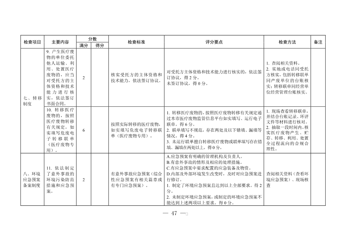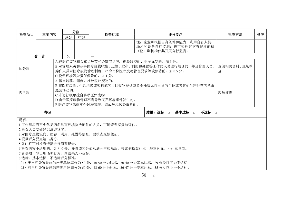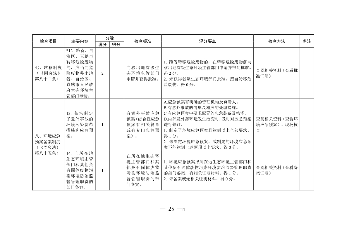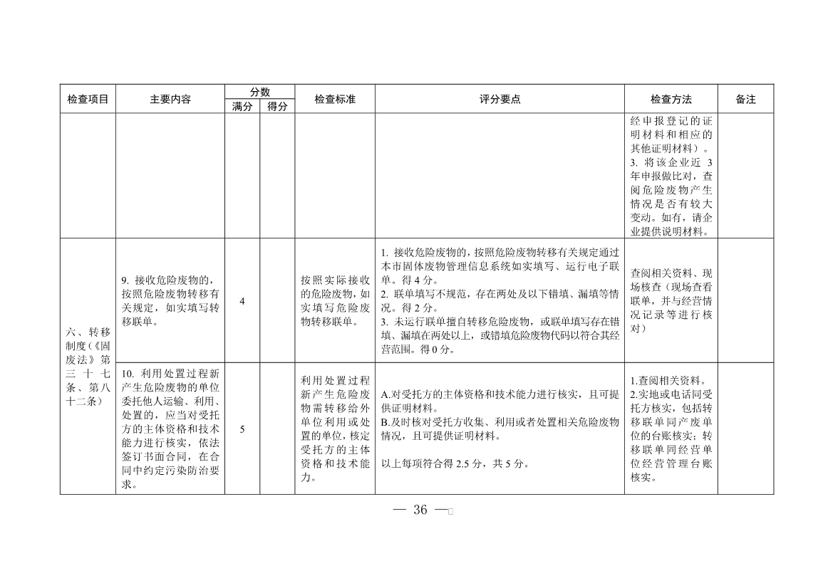 (二)市級(jí)評(píng)估。市生態(tài)環(huán)境局每年按照《危險(xiǎn)廢物規(guī)范化環(huán)境管理評(píng)估指標(biāo)》(附件1,以下簡稱《評(píng)估指標(biāo)》)評(píng)估各區(qū)危險(xiǎn)廢物規(guī)范化環(huán)境環(huán)境管理情況,并對(duì)本市危險(xiǎn)廢物規(guī)范化環(huán)境環(huán)境管理情況進(jìn)行自評(píng)。市環(huán)境執(zhí)法總隊(duì)按照《檢查要點(diǎn)》(附件2)附表2-1對(duì)市管危險(xiǎn)廢物產(chǎn)廢單位進(jìn)行檢查,并填寫《單位檢查情況記錄表》(附件3)。市固化管理中心按照《檢查要點(diǎn)》(附件2)附表2-2對(duì)危險(xiǎn)廢物經(jīng)營單位進(jìn)行檢查,并填寫《單位檢查情況記錄表》(附件3)。