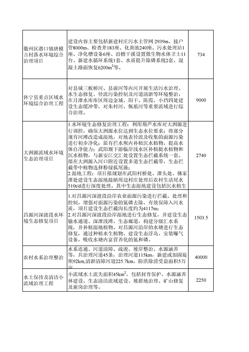 (一)水環(huán)境綜合整治工程 因地制宜綜合清淤、生態(tài)攔截等措施,實施占川河、梅溪河、下莊河﹑資源溪﹑穎溪河、 倒湖、豐溪河良好水體等河道水環(huán)境綜合整治工程。完善唐模古村、黃山高新區(qū)農(nóng) 村地區(qū)農(nóng)村污水治理設(shè)施建設(shè)及污水管網(wǎng)。