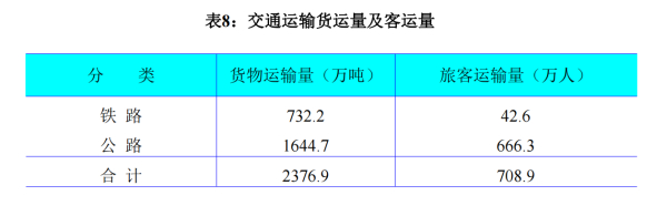 全年完成貨物運輸量2376.9萬噸,其中,鐵路運輸完成貨物發(fā)運量732.2萬噸,公路運輸完成貨物發(fā)運量1644.7萬噸;全年完成旅客運輸量708.9萬人,其中,鐵路運輸完成旅客運輸量42.6萬人,公路運輸完成旅客運輸量666.3萬人。