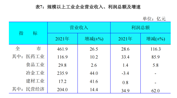 全年全市規(guī)模以上工業(yè)實現(xiàn)利潤28.6億元,比上年增長116.3%。其中,三大支柱行業(yè)實現(xiàn)利潤31.4億元,增長143.4%;全市規(guī)模以上工業(yè)實現(xiàn)營業(yè)收入461.9億元,比上年增長26.5%。其中,醫(yī)藥、食品和冶金工業(yè)實現(xiàn)營業(yè)收入382.6億元,增長28.0%。