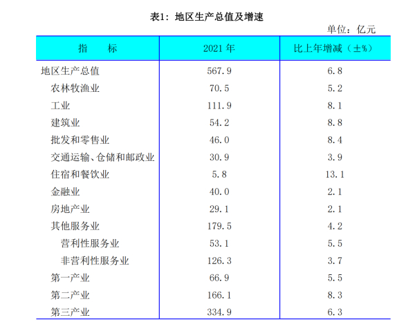 初步核算,2021年,全市實現(xiàn)地區(qū)生產(chǎn)總值(GDP)567.9億元,按可比價格計算,比上年增長6.8%。其中,第一產(chǎn)業(yè)增加值 66.9億元,增長5.5%;第二產(chǎn)業(yè)增加值166.1億元,增長8.3%;第三產(chǎn)業(yè)增加值334.9億元,增長6.3%。人均GDP達37080元,比上年增長7.3%。[2]