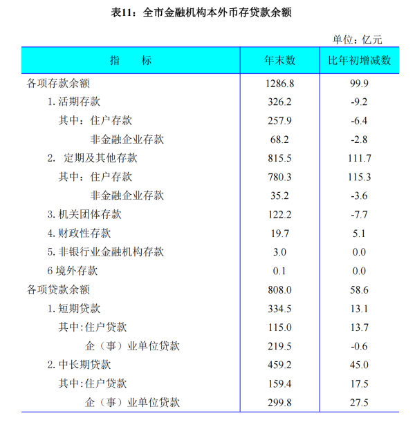 全年全市金融業(yè)實現(xiàn)增加值40.0億元,比上年增長2.1%。全市金融機構(gòu)本外幣各項存款余額1286.8億元,比年初增加99.9億元。其中,活期存款326.2億元,比年初減少9.2億元;定期及其他存款815.5億元,比年初增加111.7億元。金融機構(gòu)本外幣各項貸款余額808.0億元,比年初增加58.6億元。其中,短期貸款余額334.5億元,比年初增加13.1億元;中長期貸款余額459.2億元, 比年初增加45.0億元。