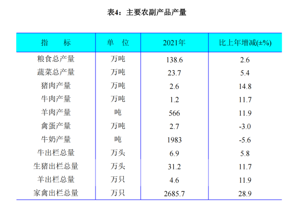 全年牛出欄總量達6.9萬頭,比上年增長5.8%;生豬出欄總量達31.2萬頭,增長11.7%;家禽出欄總量達2685.7萬只,增長28.9%;羊出欄總量達4.6萬只,增長11.9%。豬肉產(chǎn)量2.6萬噸,增長14.8%;牛肉產(chǎn)量1.2萬噸,增長11.7%;羊肉產(chǎn)量566噸,增長11.9%;禽蛋產(chǎn)量2.7萬噸,下降3.0%;牛奶產(chǎn)量1983噸,下降5.6%。