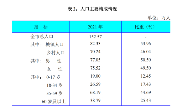 2021年末,全市戶籍總?cè)丝跒?52.57萬人,比上年末減少1.17萬人。全年出生人口5709人,出生率為3.73‰,比上年下降1.09個千分點;死亡人口7706人,死亡率為5.03‰,比上年下降8.21個千分點;人口自然增長率為-1.30‰,比上年上升7.12個千分點。