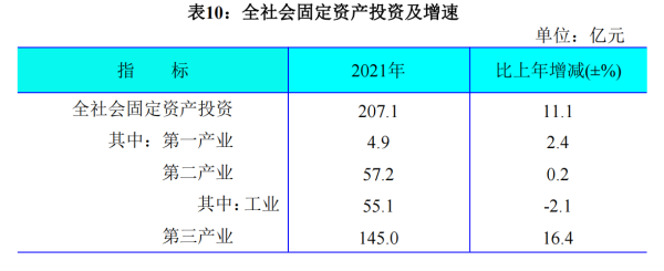 全年完成全社會固定資產(chǎn)投資207.1億元,比上年增長11.1%。其中,第一產(chǎn)業(yè)完成投資4.9億元,增長2.4%;第二產(chǎn)業(yè)完成投資57.2億元,增長0.2%;第三產(chǎn)業(yè)完成投資145.0億元,增長16.4%。投資億元以上的施工項目110個,完成投資134.2億元,比上年增長31.9%。