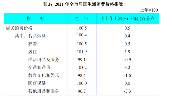 全年居民消費價格比上年上漲0.5%,八大類指標呈四漲一平三降態(tài)勢。食品煙酒類價格上漲0.4%,衣著類價格上漲0.5%,居住類價格上漲1.9%,生活用品及服務(wù)類價格下降0.9%,交通和通信類價格上漲3.2%,教育文化和娛樂類價格下降1.6%,醫(yī)療保健類價格持平,其他用品和服務(wù)類價格下降3.3%。