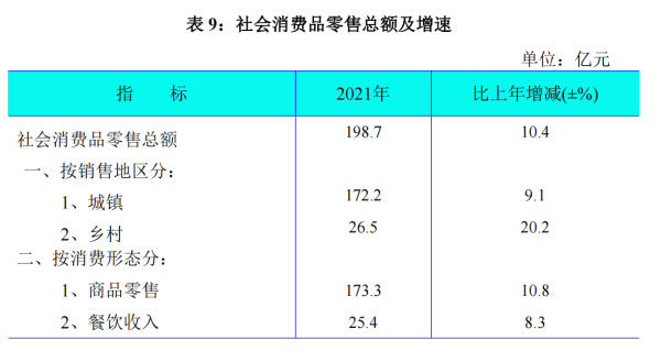 全年實現(xiàn)社會消費品零售總額198.7億元,同比增長10.4%,增幅比上年同期提高19.7個百分點。