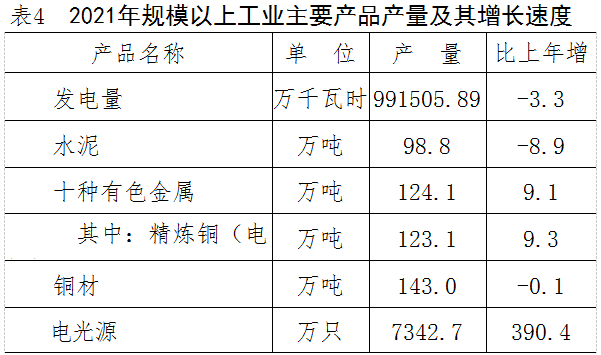 全年規(guī)模以上工業(yè)主要工業(yè)品中:發(fā)電量991505.89萬千瓦時(shí),下降3.3%;水泥98.8萬噸,下降8.9%;精煉銅123.1萬噸,增長9.3%;銅材143萬噸,下降0.1%;電光源7342.7萬只,增長390.4%。工程資料_模版下載_十四五