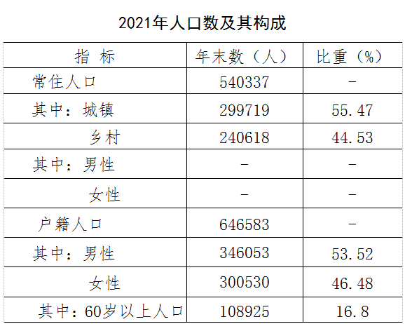年末常住人口540337人,比上年末減少305人。其中,城鎮(zhèn)人口299719人,占常住人口的比重為55.47%,比上年末提高1.08個(gè)百分點(diǎn)。年末戶籍人口646583人,比上年末增加768人。60歲以上人口108925人,占全市戶籍人口的16.8%,超出老齡化標(biāo)準(zhǔn)6.8個(gè)百分點(diǎn)。大牛工程師