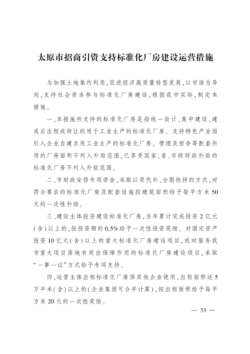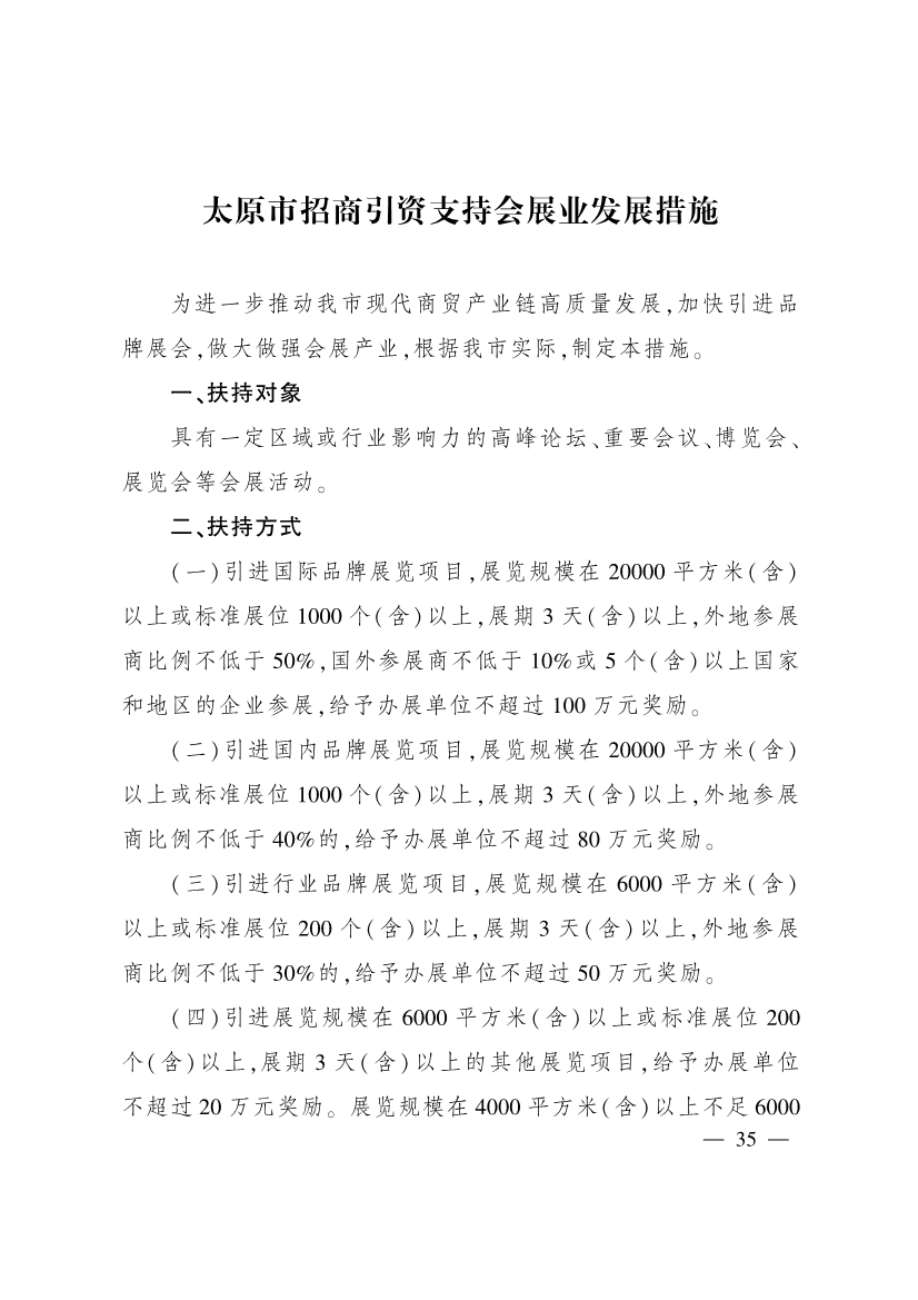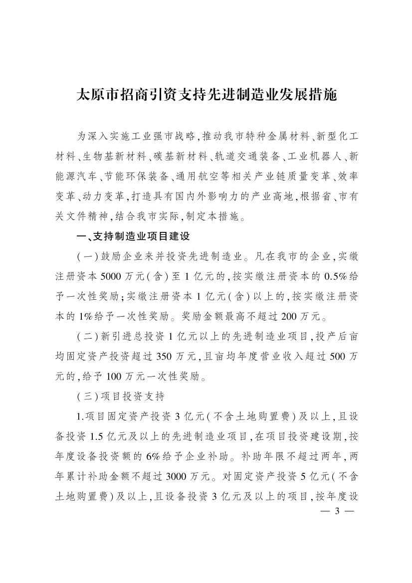 為進(jìn)一步加大招商引資力度,促進(jìn)產(chǎn)業(yè)結(jié)構(gòu)優(yōu)化升級,推動全市經(jīng)濟(jì)高質(zhì)量發(fā)展,市有關(guān)部門制定了《太原市招商引資支持先進(jìn)制造業(yè)發(fā)展措施》《太原市招商引資支持新一代信息技術(shù)產(chǎn)業(yè)發(fā)展措施》《太原市招商引資支持現(xiàn)代農(nóng)業(yè)產(chǎn)業(yè)發(fā)展措施》《太原市招商引資支持商貿(mào)流通業(yè)發(fā)展措施》《太原市招商引資支持文旅產(chǎn)業(yè)發(fā)展措施》《太原市招商引資支持新能源產(chǎn)業(yè)發(fā)展措施》《太原市招商引資支持標(biāo)準(zhǔn)化廠房建設(shè)運(yùn)營措施》《太原市招商引資支持會展業(yè)發(fā)展措施》等措施,經(jīng)市人民政府同意,現(xiàn)印發(fā)給你們,請按照執(zhí)行。