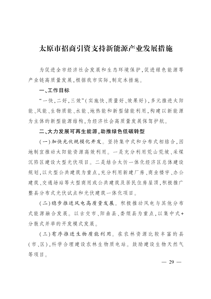 獲悉,6月29日,太原市人民政府辦公室印發(fā)太原市招商引資若干措施,其中《太原市招商引資支持新能源產(chǎn)業(yè)發(fā)展措施》中提出,“一快,二好,三效”(實(shí)施快、質(zhì)量好、效果好),多元推進(jìn)太陽能、風(fēng)能、生物質(zhì)能、水能、地?zé)崮芎托滦蛢δ芾茫瑯?gòu)建以新能源為主體的新型能源結(jié)構(gòu),為經(jīng)濟(jì)社會高質(zhì)量發(fā)展保駕護(hù)航。