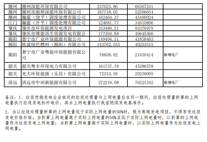 廣東省公布有關(guān)垃圾焚燒發(fā)電企業(yè)2021年下半年垃圾處理量及相關(guān)電量