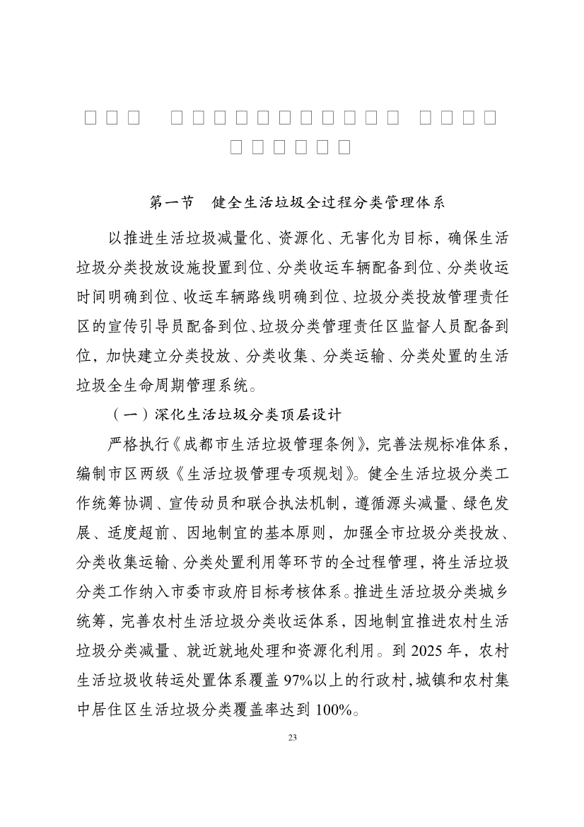 鼓勵(lì)推廣城鄉(xiāng)環(huán)衛(wèi)一體化,2025 年實(shí)現(xiàn)城鄉(xiāng)環(huán)衛(wèi)一體化作業(yè)區(qū)域占比不低于 50%。持續(xù)深化環(huán)衛(wèi)作業(yè)設(shè)施設(shè)備科技化、環(huán)衛(wèi)工人年輕化、監(jiān)管服務(wù)智慧化“三化”建設(shè),著力構(gòu)建結(jié)構(gòu)合理、技術(shù)先進(jìn)、能力充足的環(huán)衛(wèi)設(shè)施設(shè)備和環(huán)衛(wèi)隊(duì)伍保障體系,打造成都環(huán)衛(wèi)產(chǎn)業(yè)品牌,爭(zhēng)創(chuàng)中國(guó)最干凈城市。