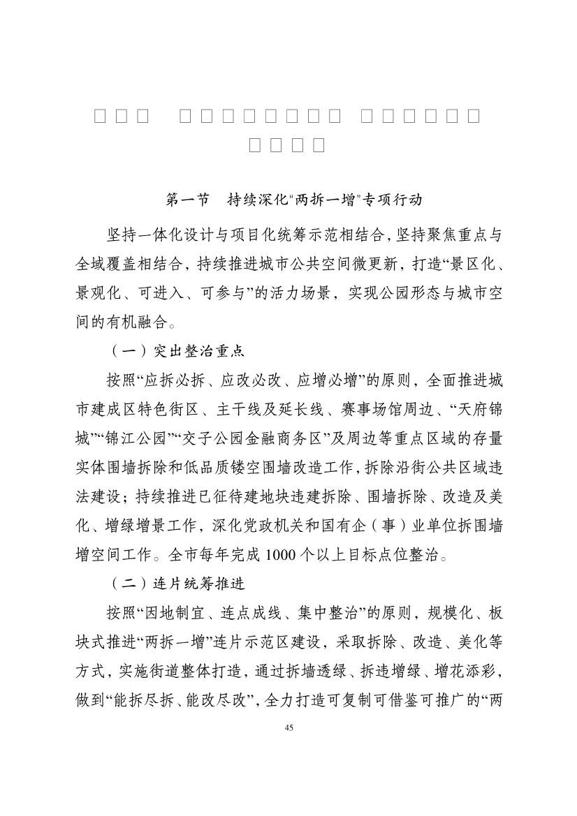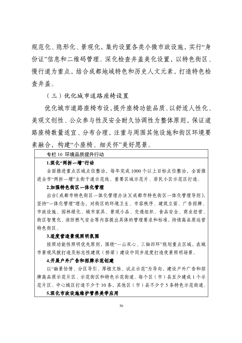 《規(guī)劃》明確,到2025年,成都生活垃圾無(wú)害化處理率達(dá)100%,“有路無(wú)燈、有燈不亮”問(wèn)題動(dòng)態(tài)清零率達(dá)100%,建成區(qū)公廁密度達(dá)5-6座/k㎡,完成“兩拆一增”整治點(diǎn)位不少于5000個(gè),背街小巷品質(zhì)提升不少于600條。