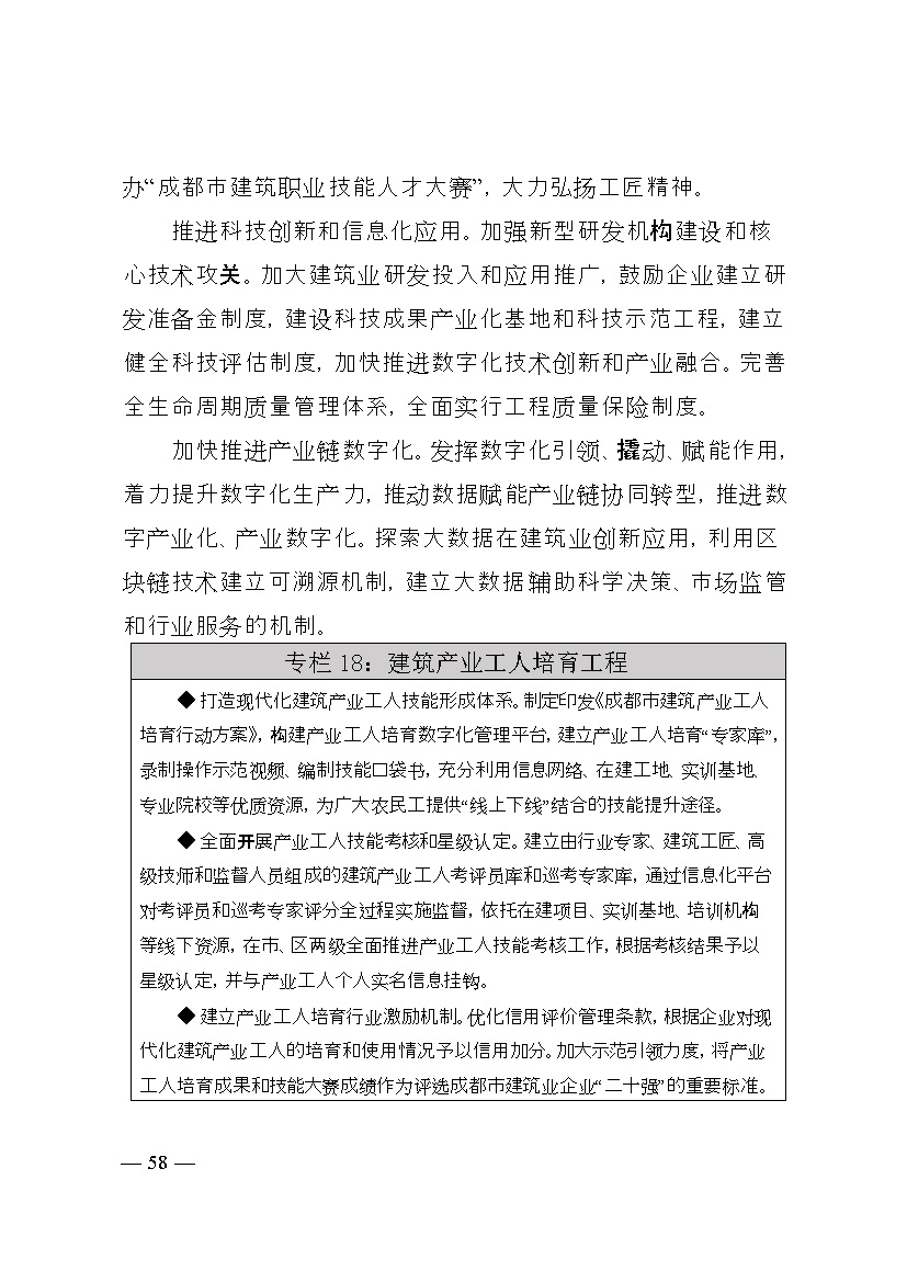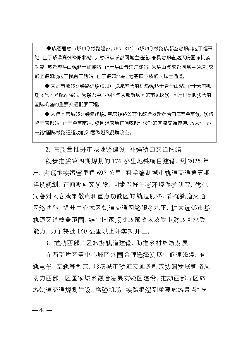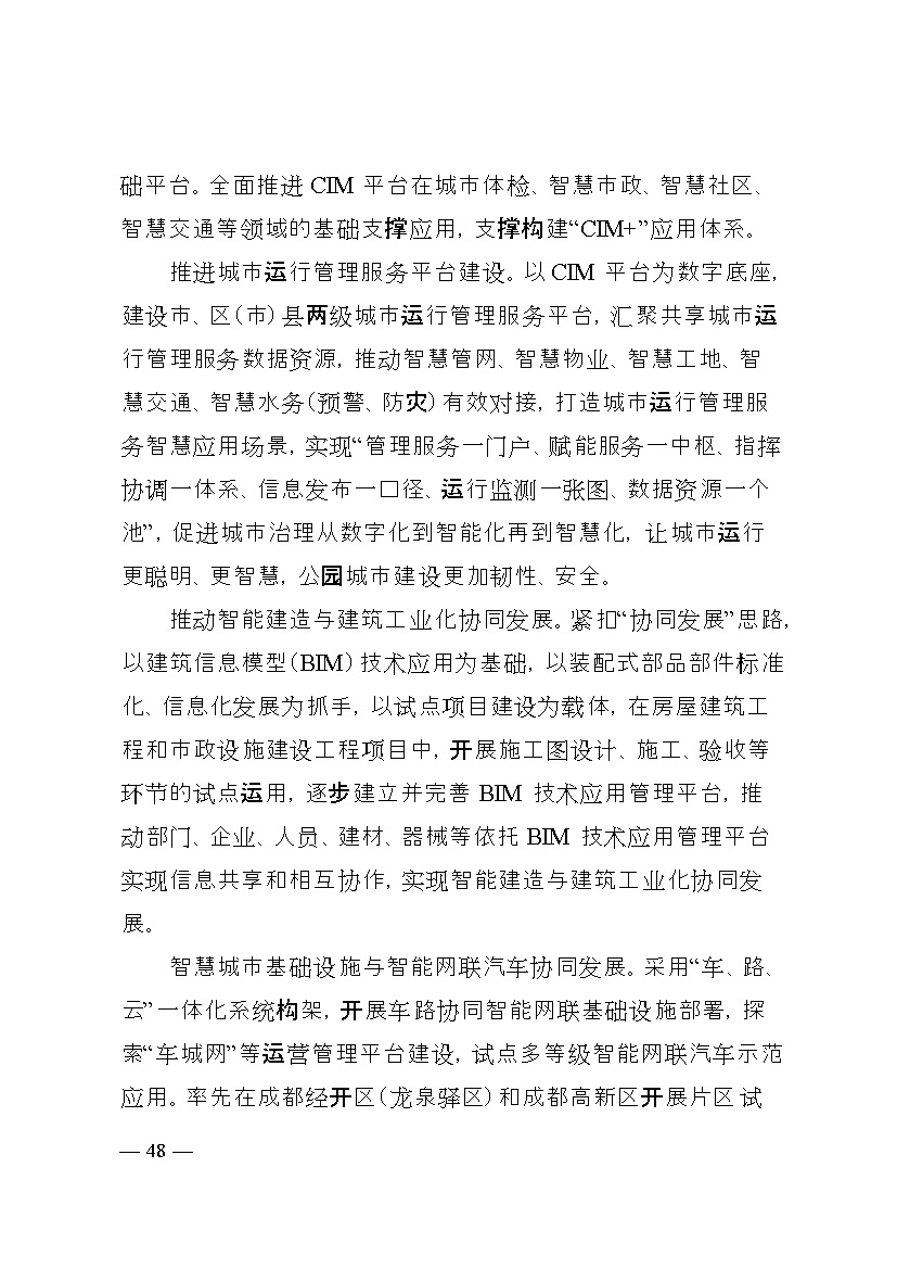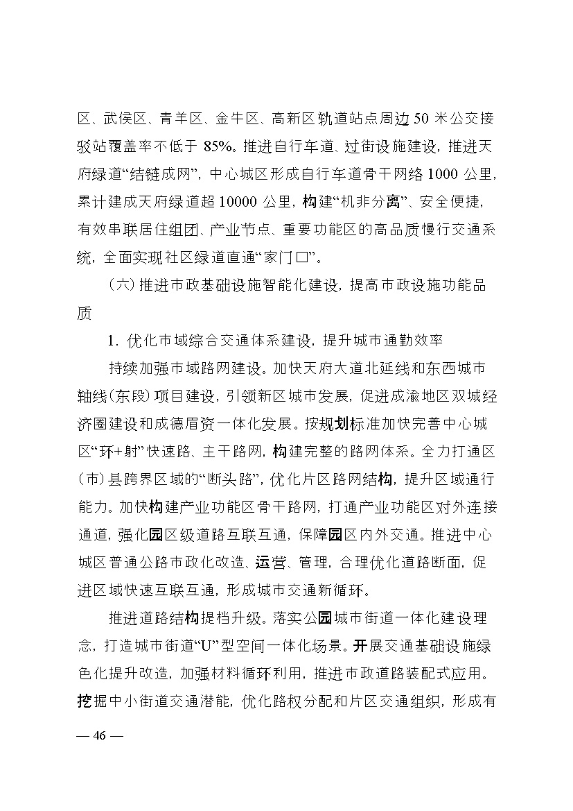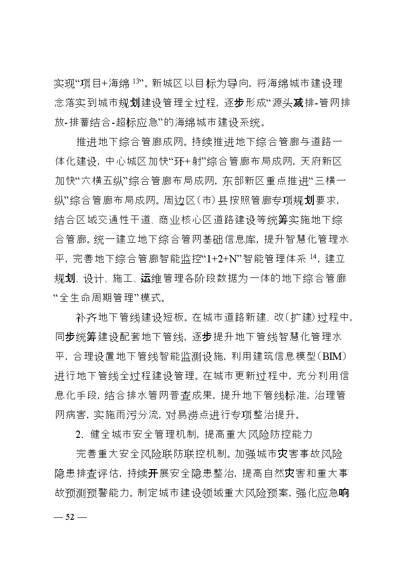推進地下綜合管廊成網。持續(xù)推進地下綜合管廊與道路一體化建設,中心城區(qū)加快“環(huán)+射”綜合管廊布局成網,天府新區(qū)加快“六橫五縱”綜合管廊布局成網,東部新區(qū)重點推進“三橫一縱”綜合管廊布局成網。周邊區(qū)(市)縣按照管廊專項規(guī)劃要求,結合區(qū)域交通性干道、商業(yè)核心區(qū)道路建設等統(tǒng)籌實施地下綜合管廊。統(tǒng)一建立地下綜合管網基礎信息庫,提升智慧化管理水平,完善地下綜合管廊智能監(jiān)控“1+2+N”智能管理體系14,建立規(guī)劃、設計、施工、運維管理各階段數據為一體的地下綜合管廊“全生命周期管理”模式。